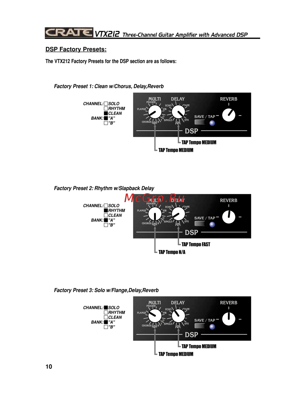 - Each channel of the vtx212 has two factory assigned dsp presets as shown on pages 10 and 11 no matter what the settings of the dsp controls the preset is recalled when a channel is selected you may change the dsp settings by rotating the dsp con trols these changes will remain active until a different channel is selected but will not be there for later use unless they are saved to save a new dsp preset to a channel first make the desired dsp changes then press and hold the save tap button for about three seconds the save tap led will flash through three quick sequences indicating the preset was saved the new preset is stored for that channel and will remain in mem ory until a new preset is stored for that channel or the factory presets are restored p.8