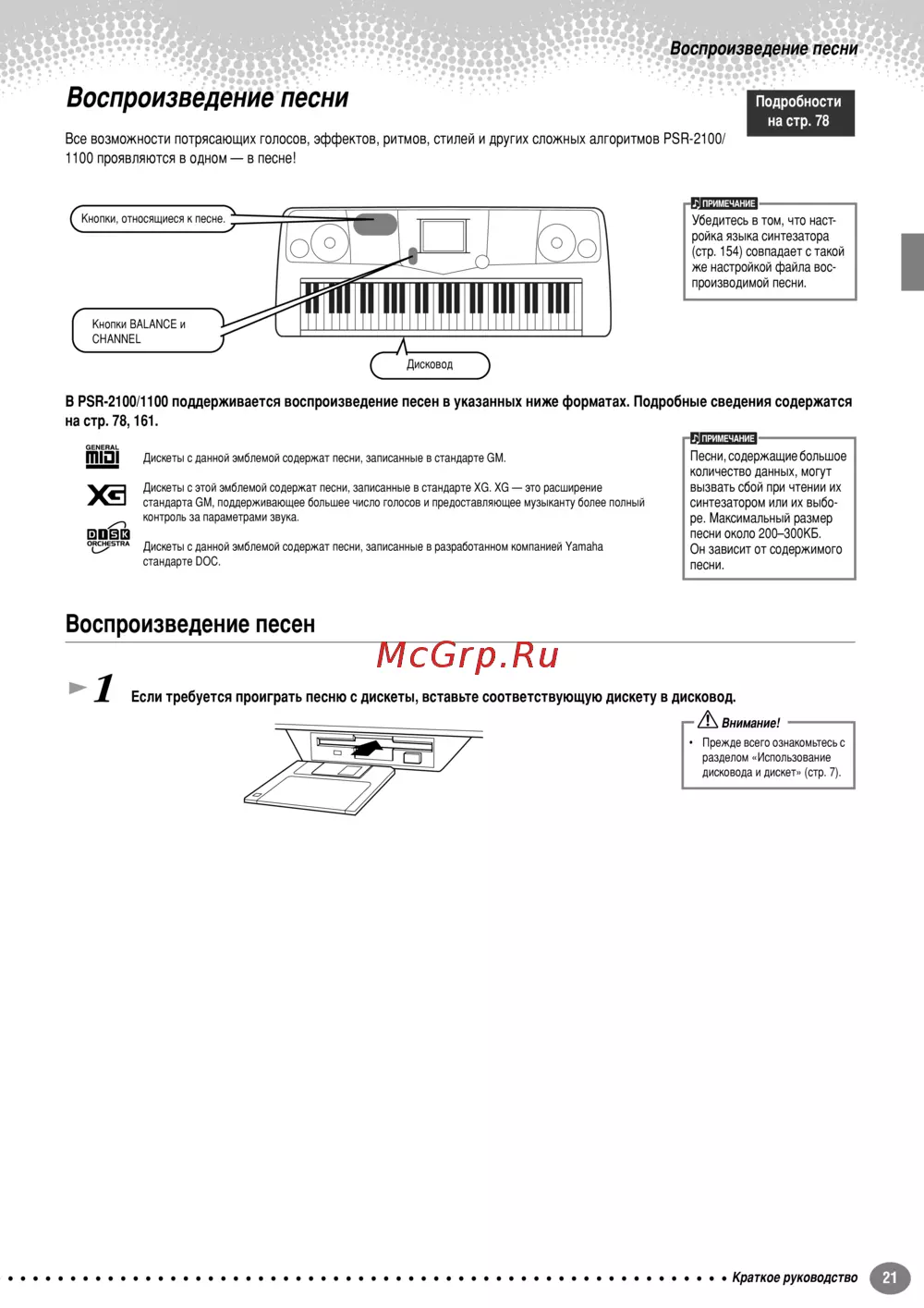 Воспроизведение песни Воспроизведение песни Подробности на стр 78 Все возможности потрясающих голосов эффектов ритмов стилей и других сложных алгоритмов РБВ 2100 1100 проявляются в одном в песне Убедитесь в том что наст ройка языка синтезатора стр 154 совпадает с такой же настройкой файла вос производимой песни В РЗП 2100 1100 поддерживается воспроизведение песен в указанных ниже форматах Подробные сведения содержатся на стр 78 161 ПРИМЕЧАНИЕ GENERAL ГП1ДI Дискеты с данной эмблемой содержат песни записанные в стандарте GM Дискеты с этой эмблемой содержат песни записанные в стандарте XG XG это расширение стандарта GM поддерживающее большее число голосов и предоставляющее музыканту более полный контроль за параметрами звука впей ояснеэтвл Дискеты с данной эмблемой содержат песни записанные в разработанном компанией Yamaha стандарте DOC Песни содержащие большое количество данных могут вызвать сбой при чтении их синтезатором или их выбо ре Максимальный размер песни около 200 300КБ Он зависит от содержимого песни Воспроизведение песен Если требуется проиграть песню с дискеты вставьте соответствующую дискету в дисковод Внимание Прежде всего ознакомьтесь с разделом Использование дисковода и дискет стр 7 Краткое руководство