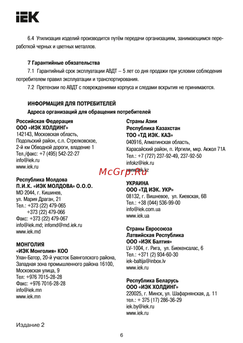 EK 6 4 Утилизация изделий производится путём передачи организациям занимающимся пере работкой черных и цветных металлов 7 Гарантийные обязательства 7 1 Гарантийный срок эксплуатации АВДТ 5 лет со дня продажи при условии соблюдения потребителем правил эксплуатации и транспортирования 7 2 Претензии по АВДТ с повреждениями корпуса и следами вскрытия не принимаются ИНФОРМАЦИЯ ДЛЯ ПОТРЕБИТЕЛЕЙ Адреса организаций для обращения потребителей Российская Федерация ООО ИЭК ХОЛДИНГ Страны Азии 142143 Московская область ТОО ТД ИЭК КАЗ Подольский район с п Стрелковское 040916 Алматинская область Республика Казахстан 2 й км Обводной дороги владение 1 Карасайский район п Иргили мкр Акжол 71А Тел факс 7 495 542 22 27 Тел 7 727 237 92 49 237 92 50 info iek ru infokz iek ru www iek ru www iek kz Республика Молдова П И К ИЭК МОЛДОВА 0 0 0 УКРАИНА ООО ТД ИЭК УКР МО 2044 г Кишинев 08132 г Вишневое ул Киевская 6В ул Мария Драган 21 Тел 38 044 536 99 00 Тел 373 22 479 065 info iek com ua 373 22 479 066 www iek ua Факс 373 22 479 067 nfo iek md infomd md iek ru Страны Евросоюза Латвийская Республика ООО ИЭК Балтия www iek md МОНГОЛИЯ ИЭК Монголия КОО LV 1004 г Рига ул Биекенсалас 6 Тел 371 2 934 60 30 Улан Батор 20 й участок Баянголского района iek baltija inbox lv Западная зона промышленного района 16100 www iek ru Московская улица 9 Тел 976 7015 28 28 Республика Беларусь ООО ИЭК ХОЛДИНГ Факс 976 7016 28 28 info iek mn 220025 г Минск ул Шафарнянская д 11 www iek mn тел 375 17 286 36 29 iek by iek ru www iek ru Издание 2 6