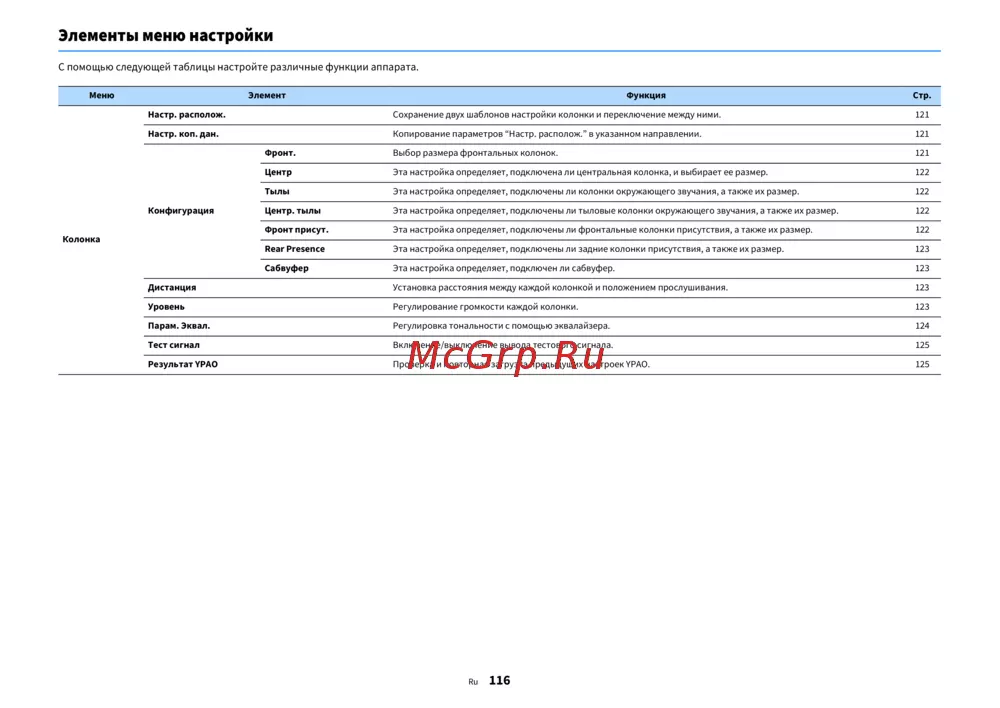 Центр. тылы Эта настройка определяет, подключены ли тыловые колонки окружающего звучания, а также их размер. 122