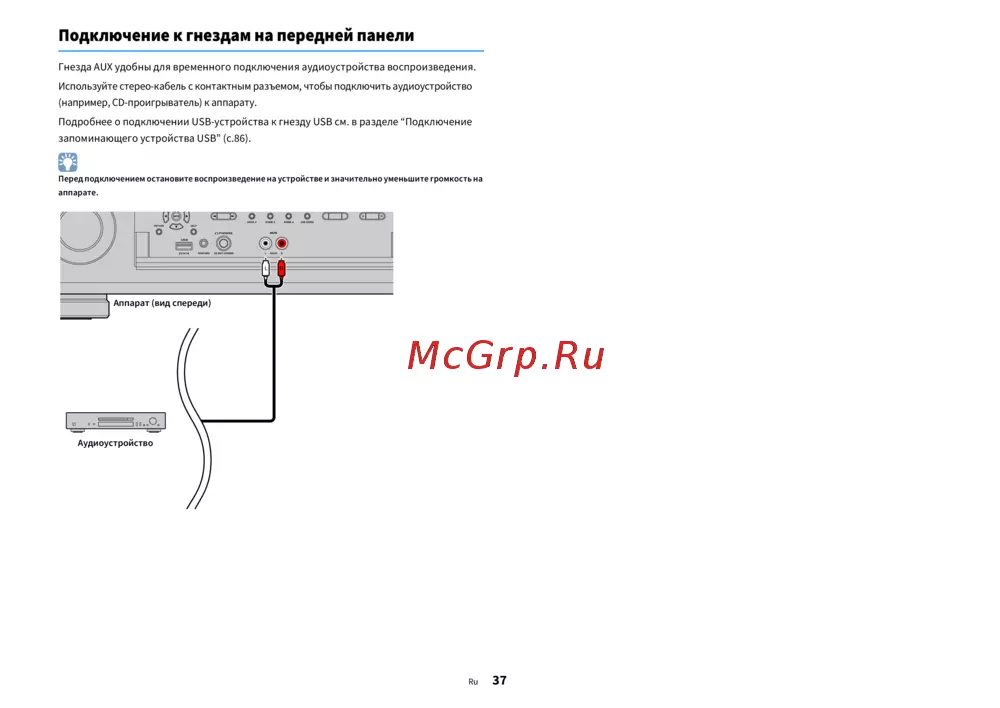 Перед подключением остановите воспроизведение на устройстве и значительно уменьшите громкость на