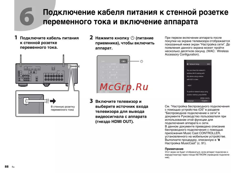 - Подключение кабеля питания к стенной розетке переменного тока и включение аппарата p.88