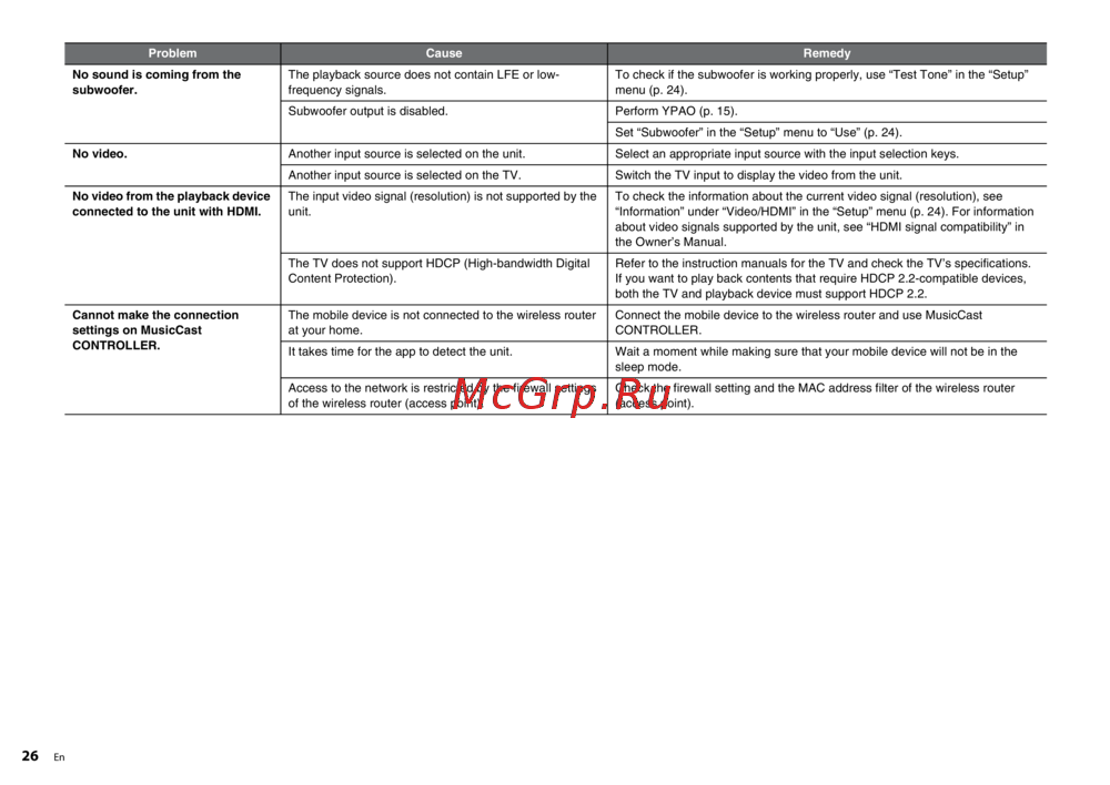 - При возникновении проблемы сначала проверьте следующее если аппарат функционирует неправильно проверьте следующее кабели питания аппарата телевизора и воспроизводящих устройств таких как bd dvd проигрыватели надежно подключены к настенным розеткам переменного тока аппарат сабвуфер телевизор и воспроизводящие устройства такие как bd dvd проигрыватели включены штекеры каждого кабеля надежно вставлены в гнезда каждого устройства при отсутствии проблем с питанием и кабелями см инструкции приведенные в таблице ниже если неисправность не указана в таблице или инструкции не помогли выключите аппарат отсоедините кабель питания и обратитесь к ближайшему авторизованному дилеру или в сервисный центр yamaha p.129