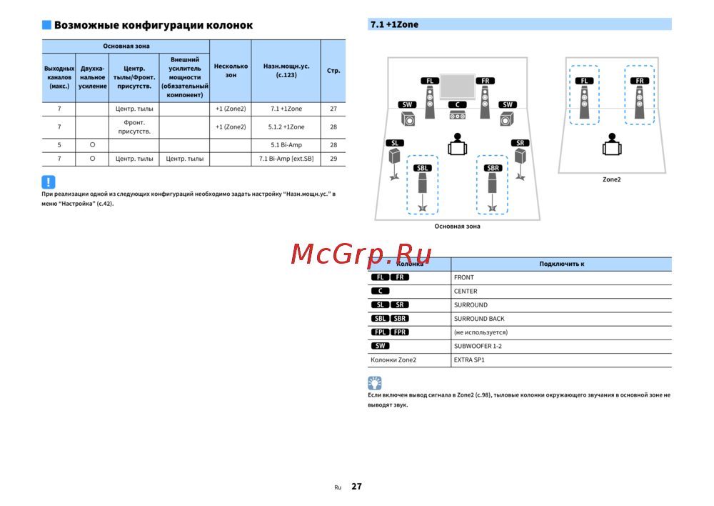 - Тип аудиосигналов направляемых в zone2 различается в зависимости от способа p.165