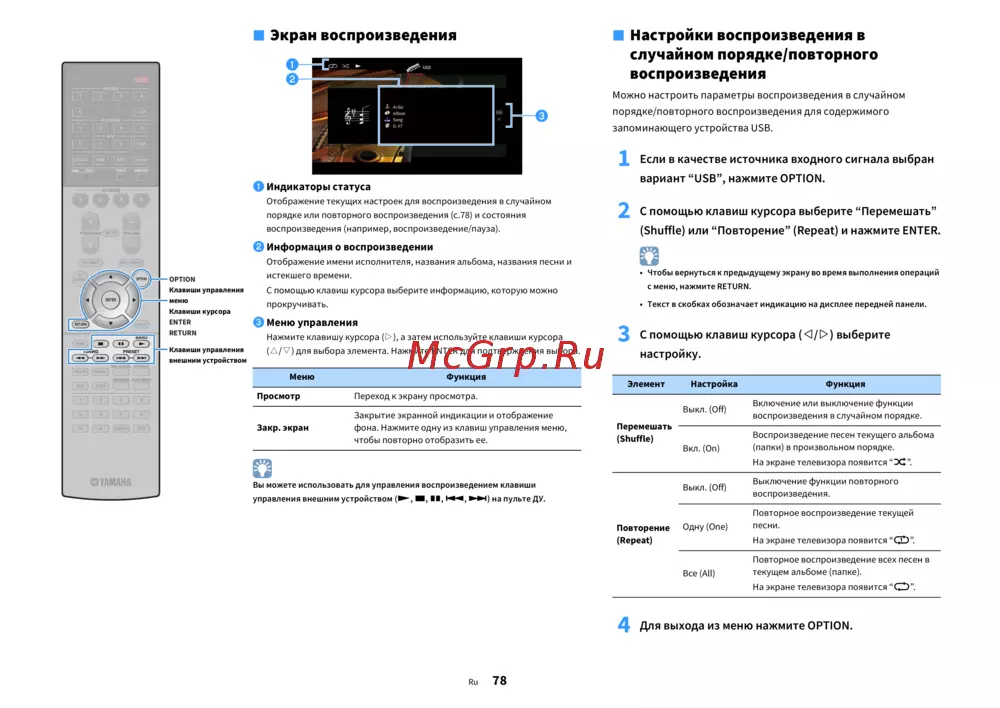 (Shuffle) или “Повторение” (Repeat) и нажмите ENTER.