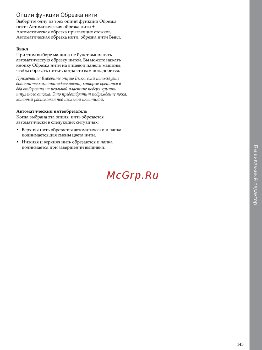 Автоматическая обрезка нити, обрезка нити Выкл.