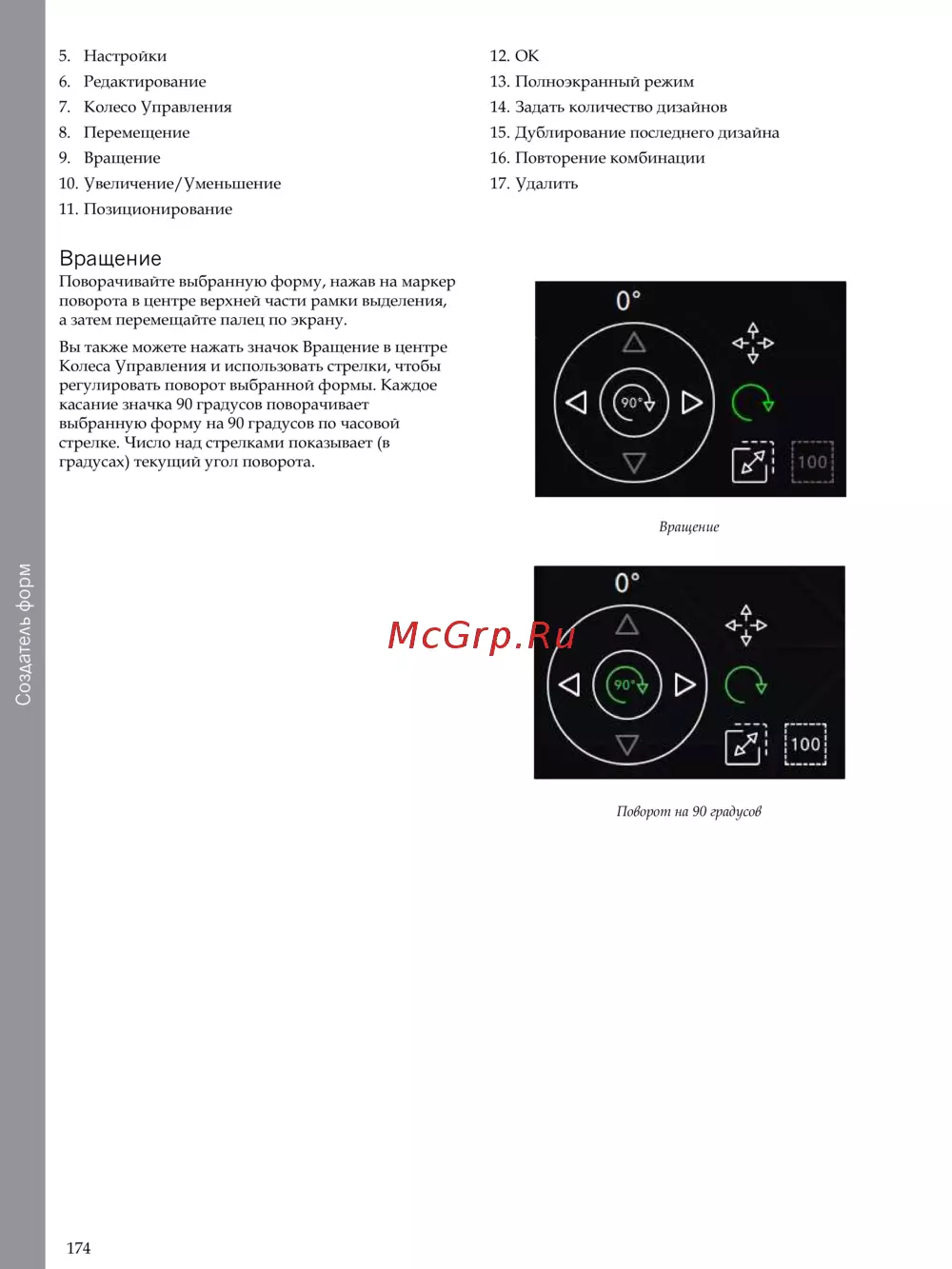 касание значка 90 градусов поворачивает