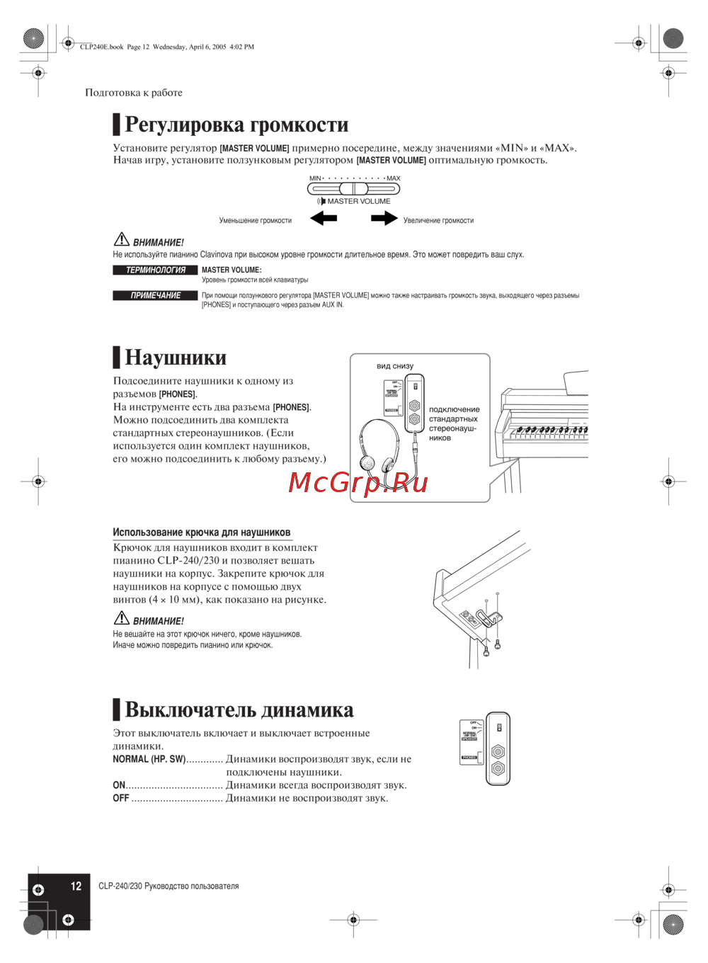 CLP240E book Page 12 Wednesday April 6 2005 4 02 PM Подготовка к работе I Регулировка громкости Установите регулятор MASTER VOLUME примерно посередине между значениями MIN и МАХ Начав игру установите ползунковым регулятором MASTER VOLUME оптимальную громкость MIN МАХ ф MASTER VOLUME Уменьшение громкости Увеличение громкости К ВНИМАНИЕ Не используйте пианино С1ампоуа при высоком уровне громкости длительное время Это может повредить ваш слух ТЕРМИНОЛОГИЯ MASTER VOLUME Уровень громкости всей клавиатуры ПРИМЕЧАНИЕ При помощи ползункового регулятора MASTER VOLUME можно также настраивать громкость звука выходящего через разъемы PHONESI и поступающего через разъем AUX IN Наушники Подсоедините наушники к одному из разъемов PHONES На инструменте есть два разъема PHONES Можно подсоединить два комплекта стандартных стереонаушников Если используется один комплект наушников его можно подсоединить к любому разъему Использование крючка для наушников Крючок для наушников входит в комплект пианино СЕР 240 230 и позволяет вешать наушники на корпус Закрепите крючок для наушников на корпусе с помощью двух винтов 4 х 10 мм как показано на рисунке А ВНИМАНИЕ Не вешайте на этот крючок ничего кроме наушников Иначе можно повредить пианино или крючок I Выключатель динамика Этот выключатель включает и выключает встроенные динамики NORMAL HP SW Динамики воспроизводят звук если не подключены наушники ON Динамики всегда воспроизводят звук OFF Динамики не воспроизводят звук CLP 240 230 Руководство пользователя
