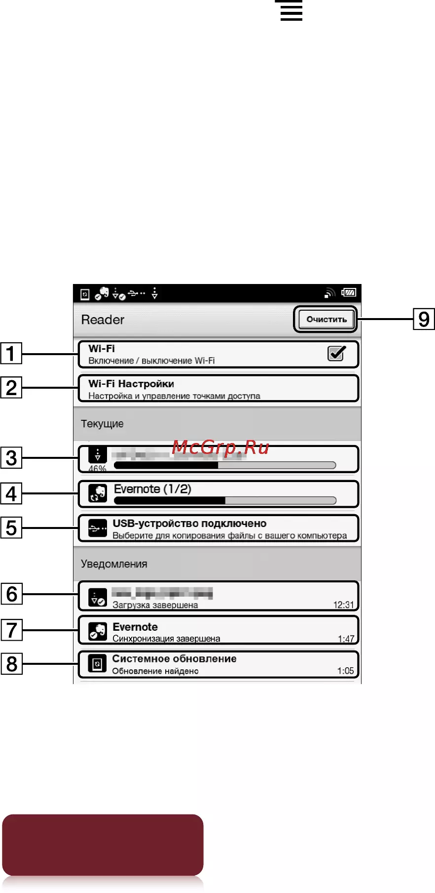 Sony PRS-T2 White [64/296] Касание строки состояния вызывает окно уведомления которое содержит сетевые элементы и другие текущие операции
