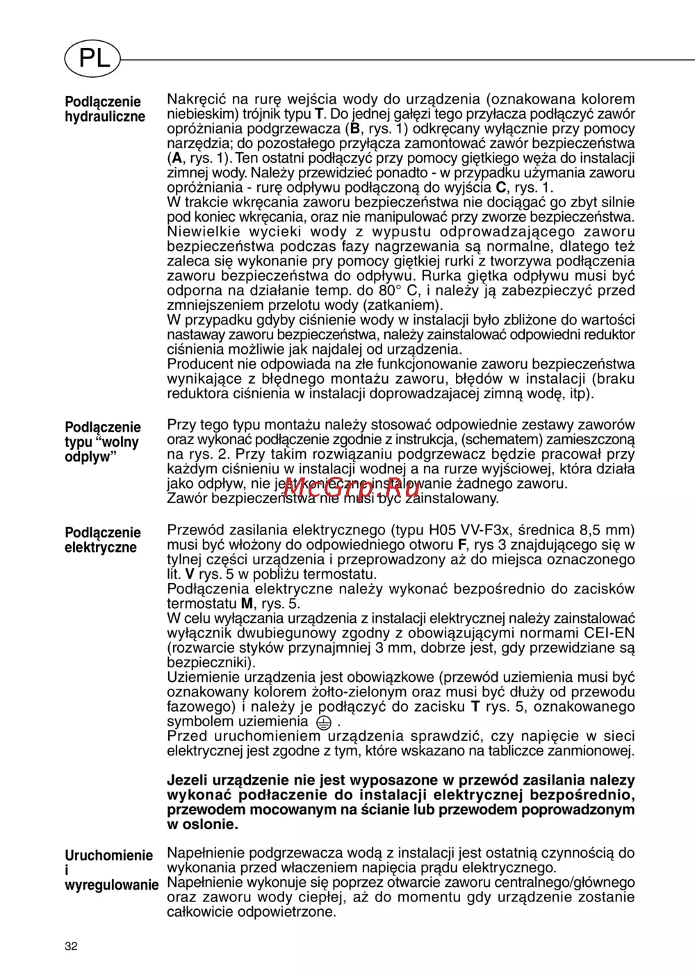 Podlqczenie hydrauliczne Nakrçcic na rurç wejscia wody do urz dzenia oznakowana kolorem niebieskim trójnik typu T Do jednej galçzi tego przylacza podlqczyc zawór oprózniania podgrzewacza B rys 1 odkrçcany wylqcznie przy pomocy narzçdzia do pozostalego przylqcza zamontowac zawór bezpieczeñstwa A rys 1 Ten ostatni podlqczyc przy pomocy giçtkiego wçza do instalacji zimnej wody Nalezy przewidziec ponadto w przypadku uzymania zaworu oprózniania rurç odptywu podlqczonq do wyjscia C rys 1 W trakcie wkrçcania zaworu bezpieczeñstwa nie dociqgac go zbyt silnie K od koniec wkrçcania oraz nie manipulowac przy zworze bezpieczeñstwa iewielkie wycieki wody z wypustu odprowadzajqcego zaworu bezpieczeñstwa podczas fazy nagrzewania sq normalne dlatego tez zaleca siç wykonanie pry pomocy giçtkiej rurki z tworzywa podtqczenia zaworu bezpieczeñstwa do odptywu Rurka giçtka odptywu musi byc odporna na dziatanie temp do 80 C i nalezy jq zabezpieczyc przed zmniejszeniem przelotu wody zatkaniem W przypadku gdyby cisnienie wody w instalacji byto zblizone do wartosci nastaway zaworu bezpieczeñstwa nalezy zainstalowac odpowiedni reduktor cisnienia mozliwie jak najdalej od urzgazenia Producent nie odpowiada na zte funkcjonowanie zaworu bezpieczeñstwa wynikajqce z btçdnego montazu zaworu btçdów w instalacji braku reduktora cisnienia w instalacji doprowadzajacej zimnq wodç itp Podlqczenie au wolny _ lyw Przy tego typu montazu nalezy stosowac odpowiednie zestawy zaworów oraz wykonac podtqczenie zgodnie z instrukcja schematem zamieszczonq na rys 2 Przy takim rozwiqzaniu podgrzewacz bçdzie pracowat przy kazdym cisnieniu w instalacji wodnei a na rurze wyjsciowej która dziala jako odptyw nie jest konieczne instalowanie zadnego zaworu Zawór bezpieczeñstwa nie musi byc zainstalowany Podlqczenie elektryczne Przewód zasilania elektrycznego typu H05 VV F3x srednica 8 5 mm musi byc wlozony do odpowiedniego otworu F rys 3 znajdujqcego siç w tylnej czçsci urzqdzenia i przeprowadzony az do miejsca oznaczonego lit V rys 5 w poblizu termostatu Podlqczenia elektryczne nalezy wykonac bezposrednio do zacisków termostatu M rys 5 W celu wylqczania urzqdzenia z instalacji elektrycznej nalezy zainstalowac wylqcznik dwubiegunowy zgodny z obowiqzujqcymi normami CEI EN rozwarcie styków przynajmniej 3 mm dobrze jest gdy przewidziane sq bezpieczniki Uziemienie urzqdzenia jest obowiqzkowe przewód uziemienia musi byc oznakowany kolorem zotto zielonym oraz musi byc dtuzy od przewodu fazowego i nalezy je podtqczyc do zacisku T rys 5 oznakowanego symbolem uziemienia ф Przed uruchomieniem urzqdzenia sprawdzic czy napiçcie w sieci elektrycznej jest zgodne z tym które wskazano na tabliczce zanmionowej Jezeli urzqdzenie nie jest wyposazone w przewód zasilania nalezy wykonac podtaczenie do instalacji elektrycznej bezposrednio przewodem mocowanym na scianie lub przewodem poprowadzonym w oslonie Uruchomienie Napelnienie podgrzewacza wodq z instalacji jest ostatniq czynnosciq do i wykonania przed wlaczeniem napiçcia prqdu elektrycznego wyregulowanie Napelnienie wykonuje siç poprzez otwarcie zaworu centralnego gtównego oraz zaworu wody cieplej az do momentu gdy urzqdzenie zostanie calkowicie odpowietrzone 32