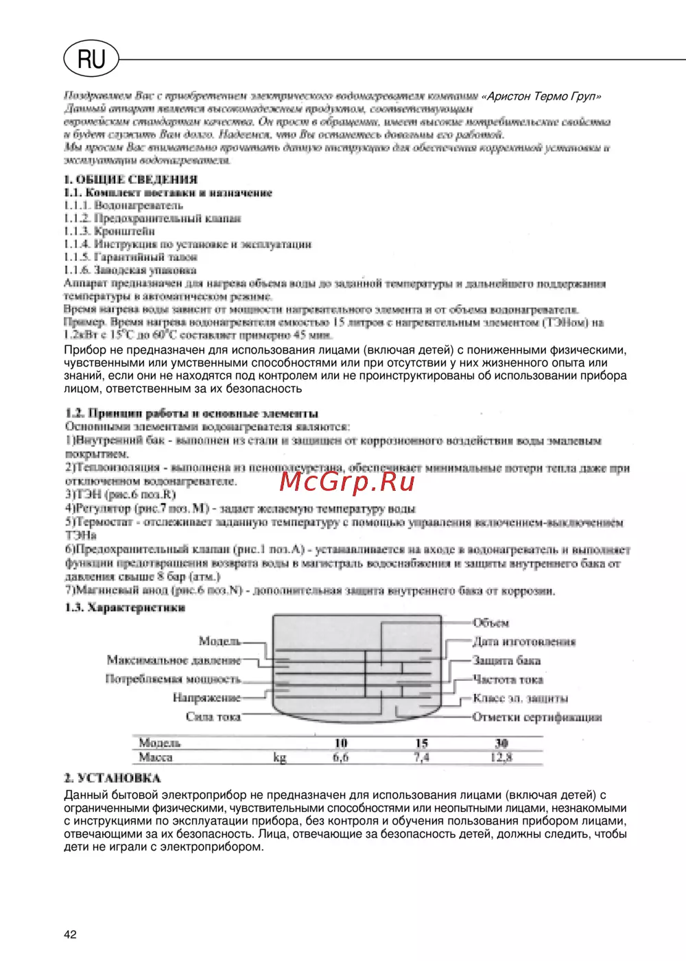 ДифашВМ Ляс г црно реянттоеи uwwwacdiMH Hanear илииш Аристон Термо Груп Aimwv л цчя к ятя n4 T MmW Nи фасетам К тк лмтяуяпнны fViarúcniM i mow fmuM г лп пю Он фнсю Граця ми uwrm выгпашг пятучЛипсн япг гвшими л óOTrm мимо ти Лило Нм генсл мто flu лили Лж м гот свкимт Ни ly м Л BHUMBBICMHO фюммнаии Атшю MimyiBifwui Ввя и6нт мш i vtmuu it WUUIMI a m iiiimmu rt n4 iwi 1 ОШИ1 СВЕДЕНИЯ 1 1 Коми wiui ившачени 1 1 1 Ho uniarpcMie ib I U 11ре кираии1саы1ый минам 1 1J Кроши icHu 1 1 4 Ииструкиив no уоникше и мшиуатаиин 1 1А ГарамIHÍÍUUU iiuniu 1 1А Затикала ynaniMM Aniiapai пре ниш и пи ны pvaa йжгмя аплы Ж мвиинон тсмгсрт уры и зимп никао полит кмпсрапры в ашичю NWVBUM JVMHWIВремя ни рема жим шамент от пют м нят кгтг1 юто isewHra и от юъс аа аолонагренатепа Прячер Время ни рема iMpiMtrn мич тмо IS пром с яфситетьимм i кмгигсм I I MInwl на I 2 Ri с I5Х МЫгС спсптвлпгт примтрио 45 мим Прибор не предназначен для использования лицами включая детей с пониженными физическими чувственными или умственными способностями или при отсутствии у них жизненного опыта или знаний если они не находятся под контролем или не проинструктированы об использовании прибора лицом ответственным за их безопасность IJ Нрмнимп работы и енпаны хаем ем tu кпмиима ijeiaeiiiMua uxuauipciuie ia amimi I Ниу ргмннй бак амоолнен ИТ стали и UULMUKH ОТ кирришияною потлейстпия волы жахвич покрытием 2 Г Ааоии иии выполнена ai пснополеуретавм и6сс1ютикаст минимпптк потери тента лаже при отклюкютлм южншремклс Л ГЭН рак 6 noi R ilPytynanip рнс 7 пот М исыст желаемую температуру вади 5 Гермост пт отстежимс мданную температуру с помощью ициалемиа аала нснисм еы1вютсиасм ГУМа 6 11релохрапите 1Ы Ы1 клапан рмс1 noi A устааыалиааетса на axo it в во иншрсамтс 1ь и HUIUUMBCI ф мцин i K iniapuiiKMHB u apu i кмы a aaiaerpLib кжсняГтсния и UIIIXTIJ виутремнего ñuca от давленая свыше 8 бор атм Магпневый вилл рж 6 МП N лопо шатевмаа аовитн внутреннего Лава от аирромш IJ XapaatiepHCinaia Мп м Моле 1ата HWOTouaeiaaa Гашита бака I lo ipefi немая uiMiuavrt___________ Частота Напряжение тока р Класс ал ваши i ы Свей roía Модела Масса 10 кя 6 6 15 30 7 4 IX 1 УСТАНОВКА Данный бытовой электроприбор не предназначен для использования лицами включая детей с ограниченными физическими чувствительными способностями или неопытными лицами незнакомыми с инструкциями по эксплуатации прибора без контроля и обучения пользования прибором лицами отвечающими за их безопасность Лица отвечающие за безопасность детей должны следить чтобы дети не играли с электроприбором 42