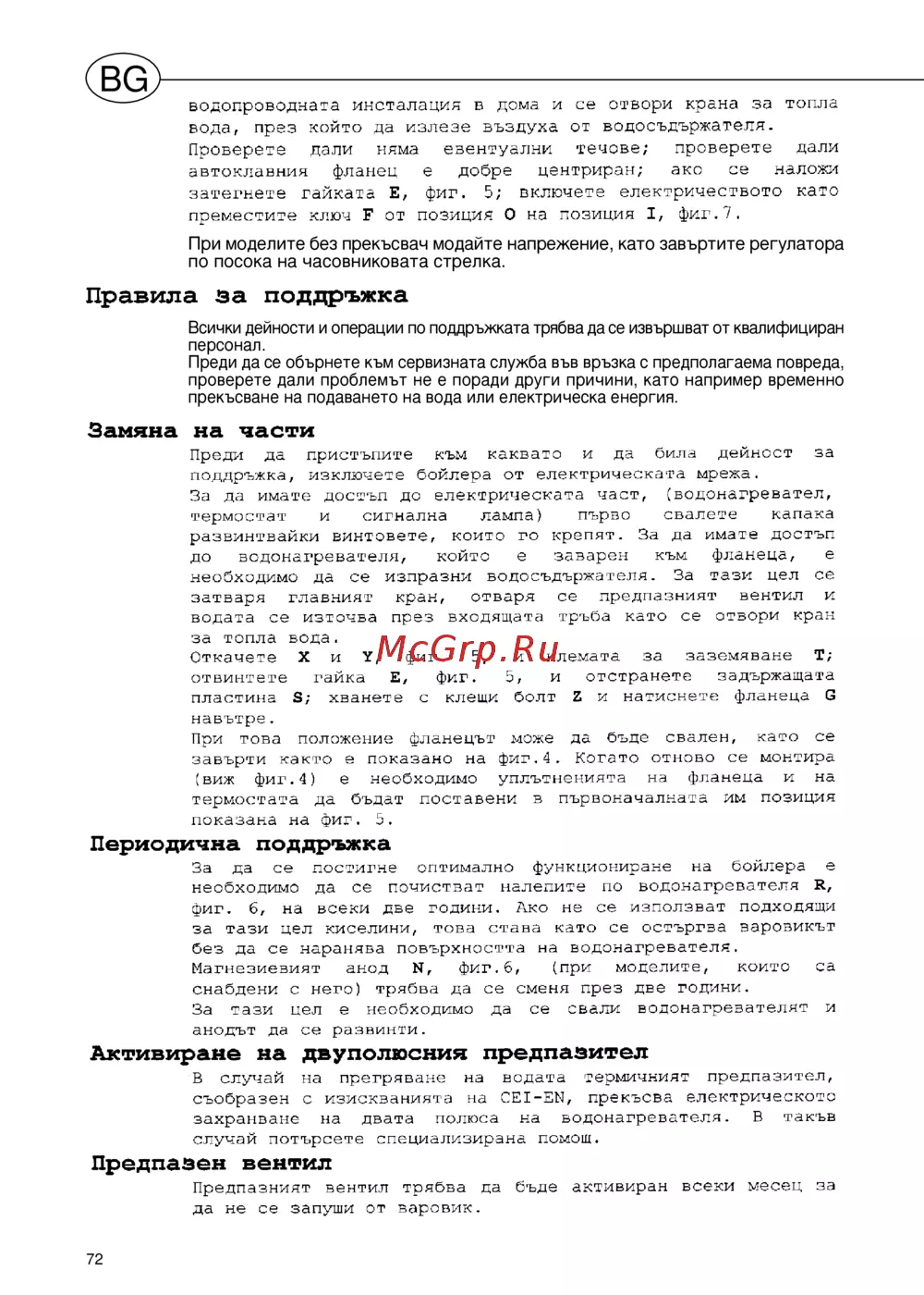 ВО водопровода а та инсталация в дома и са отвори крана за тог па вода през конто да иэлсэс зъздуха от воцссъдържатсля Проверите дали ияма евентуалии течове пропорете дали автоклавния фланец е добре центриран ако се наложи затсткете гайкаха Е фиг б включете еле е ричеството като иреместите ключ К ст позиция О нэ позиция I фиг 7 При моделите без прекъевач модайте напрежение като завъртите регулатора по посока на часовниковата стрелка Правила за поддръжка Всички дейности и операции по поддръжката трябва да се извършват от квалифициран персонал Преди да се обърнете към сервизната служба във връзка с предполагаема повреда проверете дали проблемът не е поради други причини като например временно прекъеване на подаването на вода или електрическа енергия Замяна на части Преди да лриегыхите към какватс и да била дейност за юцдсъжка изключесе бойлера от електрическата мрежа За да имате достъп до електрическата част зодснагревател термостат и сиснална лампа първс сва гсте капака раззинтвайки винтовете конто го крепят За да имате достъп до водонагревателя конто с заварен към фланеца е необходимо да се излразни волосъдържателя За тази цел се затварн главният кран осваря се г радпазният вентил и водаса се изеочва през вхецящата тр ьба като се отвори кран за топла вода Откачете X и Y фиг 5 и клемата за заземяванс Т отвинтете гайка Е фиг 5 и огстранете зэлържадата пластина S хванете с клещи болт Z и натиенвее фланеца G наветре При това положение фланецът меже да бъдо свален аоо се завърти кэк о е показано на фиг 4 Когото отцово се ыонсира виж фиг 4 е необходимо уплътиопиятэ на фланеца и на теомшиата да бъдат поставени н сървокачалната им позиция показана на фиг Ь Периодична поддръжка За да необходимо фиг за 6 се посгигне ла се на тази всега дел ептималмо почиете две кисе ни функционерах а Нелепице годики тона iKO не стана па но се като бойлере ьоцонагревотеля е R изполэват подходящи осгъргаа заровикът се без да се нараняка поверхнсатта на водонагревателя Магпсаиевлят сиабдспи За тази анод о N него цел трябва е фиг б да се аоС ходкало при сменя да модели през се свали две конто са години вогонагревателят и акодът да се развинти Активиране на двуполюсния предпаэител В случай на прегряване на вэдата термичният прелпазител съобразен с изискванията на CEI ZK лрекъева елоктрическоос эахрапваис на двата полюса на водонагревателя В такьв случай потъроете сксциализирана помош Предпазен вентил Ередпазният вент хл да не се запуши от варовик 72 трабла ла бьде активиран вески мссец за