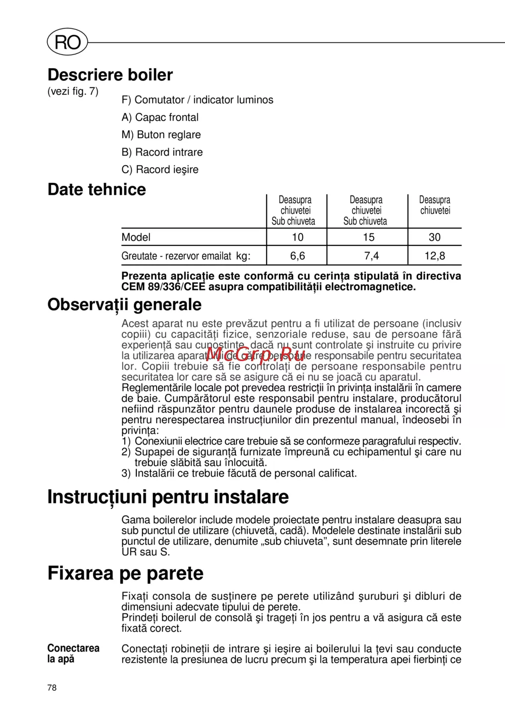 RO Descriere boiler vezi fig 7 F Comutator I indicator luminos A Capac frontal M Buton reglare B Racord intrare C Racord ie ire Date tehnice Deasupra Deasupra Deasupra chiuvetei chiuvetei chiuvetei Sub chiuvetà Sub chiuvetà Model 10 15 30 Greutate rezervor emailat kg 6 6 7 4 12 8 Prezenta aplicatie este conformà cu cerinta stipulata in directiva OEM 89 336 CEE asupra compatibilità ii electromagnetice Observatii generale Acest aparat nu este prevàzut pentru a fi utilizai de persoane inclusiv copiii cu capacitaci fizice senzoriale reduse sau de persoane farà experientà sau cuno tin e dacà nu sunt controlate i instruite cu privire la utilizarea aparatului de càtre persoane responsabile pentru securitatea lor Copiii trebuie sà fie controlaji de persoane responsabile pentru securitatea lor care sà se asigure cà ei nu se joacà cu aparatul Reglementàrile locale pot prevedea restric li in privila instalàrii in camere de baie Cumpàràtorul este responsabil pentru instalare producàtorul nefiind ràspunzàtor pentru daunele produse de instalarea incorectà i pentru nerespectarea instruc iunilor din prezentul manual indeosebi in privin a 1 Conexiunii electrice care trebuie sà se conformeze paragrafului respectiv 2 Supapei de siguranjà furnizate impreunà cu echipamentul i care nu trebuie slàbità sau inlocuità 3 Instalàrii ce trebuie fàcutà de personal calificat Instructiuni pentru instalare Gama boilerelor include modele proiectate pentru instalare deasupra sau sub punctul de utilizare chiuvetà cadà Modelele destinate instalàrii sub punctul de utilizare denumite sub chiuvetà sunt desemnate prin literele UR sau S Fixarea pe parete Fixa i consola de susjinere pe perete utilizànd uruburi i dibluri de dimensiuni adecvate tipului de perete Prindeti boilerul de consolà 1 trage i in jos pentru a và asigura cà este fixatà corect Conectarea Conecta i robine ii de intrare i ie ire ai boilerului la evi sau conducte la apà rezistente la presiunea de lucru precum 1 la temperatura ape fierbin i ce 78