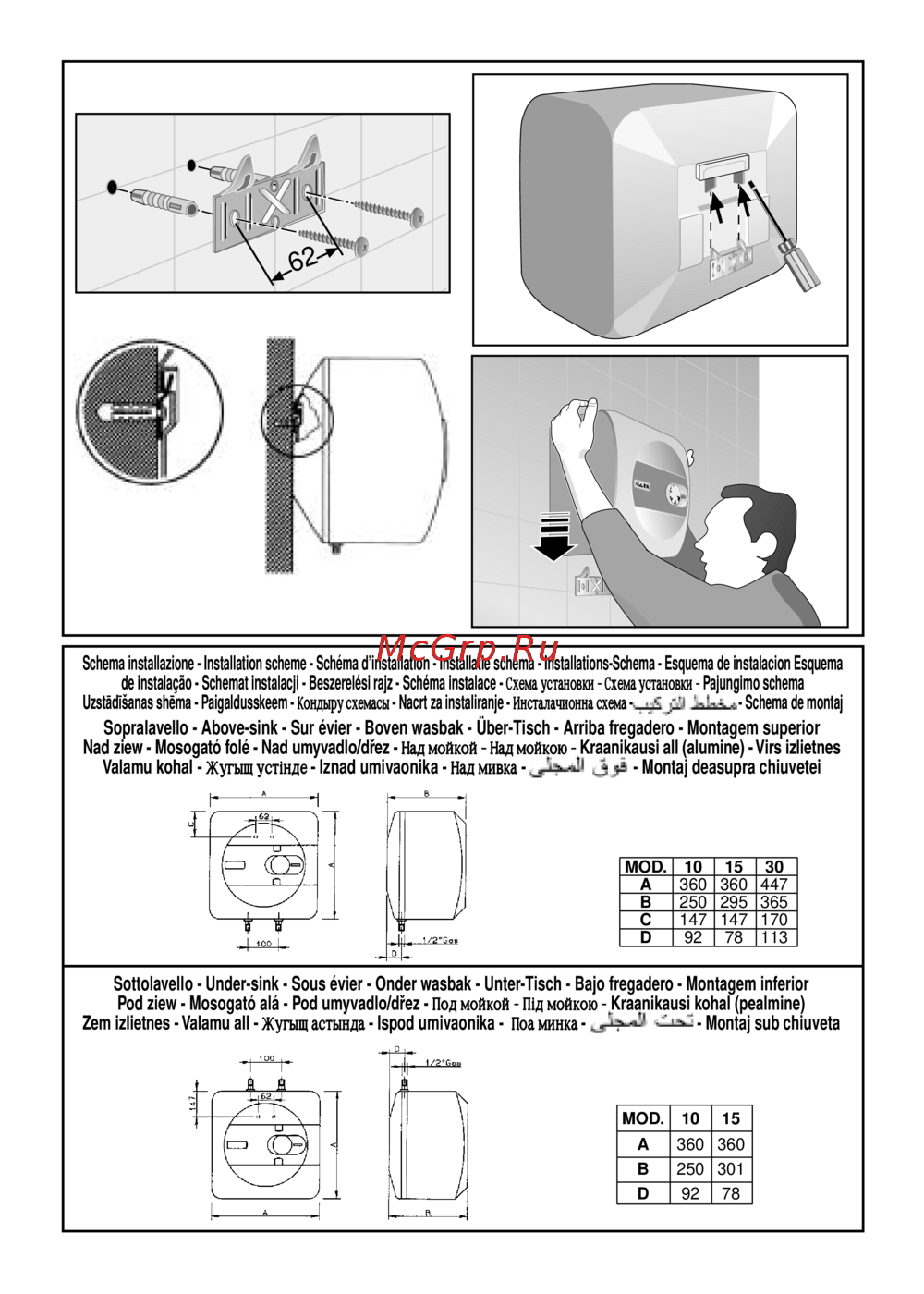 Schema installazione Installation scheme Schéma d installation Installane schema Installations Schéma Esquema de instalación Esquema de instalaçào Schemat instalacji Beszerelési rajz Schéma instalace Схема установки Схема установки Pajungimo schema Uzstâdisanas shêma Paigaldusskeem Комыру схемам Nacrt za instaliranje Инсгалачвонна схема Schema de monta Sopralavello Above sink Sur évier Boven wasbak Über Tisch Arriba fregadero Montagem superior Nad ziew Mosogató folé Nad umyvadlo dfez Над мойкой Над мойкою Kraanikausi ail alumine Virs izl ietnes Valamu kohal Жугыщ усПнде Iznad umivaonika Над мивка 3 ji Monta deasupra chiuvetei MOD 10 A 360 В 250 147 C D 92 15 30 360 295 147 447 78 365 170 113 Sottolavello Under sink Sous évier Onder wasbak Unter Tisch Bajo fregadero Montagem inferior Pod ziew Mosogató alá Pod umyvadlo dfez Под мойкой П1д мойкою Kraanikausi kohal peaImine Zem izlietnes Valamu all Жугыд астында Ispod umivaonika Поа минка Monta sub chiuveta MOD 10 I 15 A 360 360 В 250 301 D 92 78