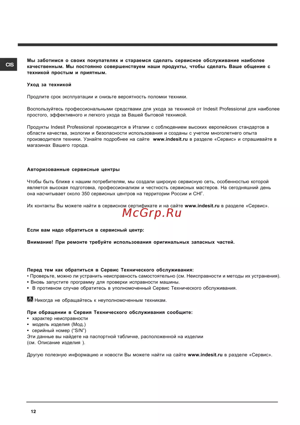 CIS Мы заботимся о своих покупателях и стараемся сделать сервисное обслуживание наиболее качественным Мы постоянно совершенствуем наши продукты чтобы сделать Ваше общение с техникой простым и приятным Уход за техникой Продлите срок эксплуатации и снизьте вероятность поломки техники Воспользуйтесь профессиональными средствами для ухода за техникой от Indesit Professional для наиболее простого эффективного и легкого ухода за Вашей бытовой техникой Продукты Indesit Professional производятся в Италии с соблюдением высоких европейских стандартов в области качества экологии и безопасности использования и созданы с учетом многолетнего опыта производителя техники Узнайте подробнее на сайте www indesit ru в разделе Сервис и спрашивайте в магазинах Вашего города Авторизованные сервисные центры Чтобы быть ближе к нашим потребителям мы создали широкую сервисную сеть особенностью которой является высокая подготовка профессионализм и честность сервисных мастеров На сегодняшний день она насчитывает около 350 сервисных центров на территории России и СНГ Их контакты Вы можете найти в сервисном сертификате и на сайте www indesit ru в разделе Сервис Если вам надо обратиться в сервисный центр Внимание При ремонте требуйте использования оригинальных запасных частей Перед тем как обратиться в Сервис Технического обслуживания Проверьте можно ли устранить неисправность самостоятельно см Неисправности и методы их устранения Вновь запустите программу для проверки исправности машины В противном случае обратитесь в уполномоченный Сервис Технического обслуживания 1 Никогда не обращайтесь к неуполномоченным техникам При обращении в Сервия Технического обслуживания сообщите характер неисправности модель изделия Мод серийный номер З М Эти данные вы найдете на паспортной табличке расположенной на изделии см Описание изделия Другую полезную информацию и новости Вы можете найти на сайте www indesit ru в разделе Сервис 12
