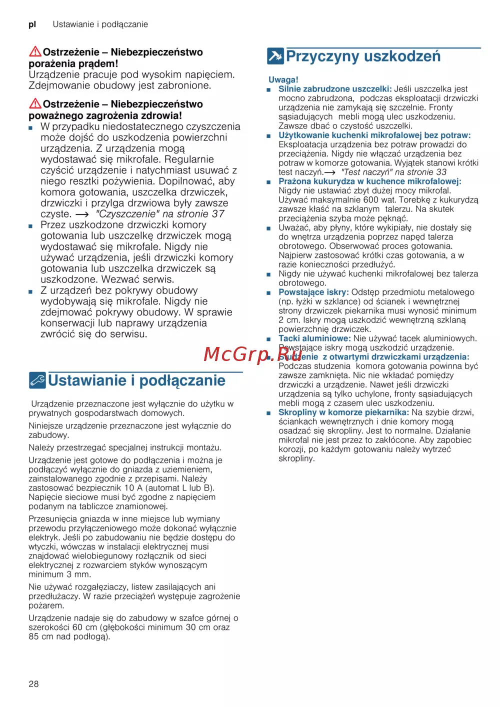 Bosch BEL523MS0 [28/92] Z urządzeń bez pokrywy obudowy wydobywają się mikrofale nigdy nie zdejmować pokrywy obudowy w sprawie konserwacji lub naprawy urządzenia zwrócić się do serwisu