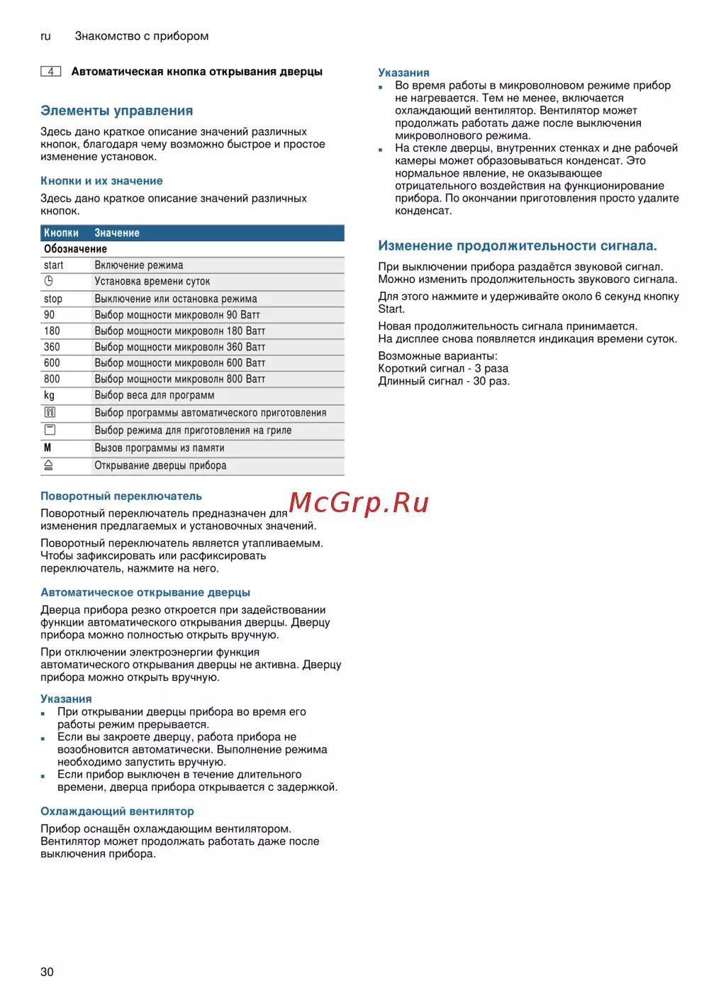 ru Знакомство с прибором I 4 I Автоматическая кнопка открывания дверцы Элементы управления Здесь дано краткое описание значений различных кнопок благодаря чему возможно быстрое и простое изменение установок Кнопки и их значение Здесь дано краткое описание значений различных кнопок Указания Во время работы в микроволновом режиме прибор не нагревается Тем не менее включается охлаждающий вентилятор Вентилятор может продолжать работать даже после выключения микроволнового режима На стекле дверцы внутренних стенках и дне рабочей камеры может образовываться конденсат Это нормальное явление не оказывающее отрицательного воздействия на функционирование прибора По окончании приготовления просто удалите конденсат Кнопки Значение Обозначение start Включение режима Установка времени суток stop Выключение или остановка режима 90 Выбор мощности микроволн 90 Ватт 180 Выбор мощности микроволн 180 Ватт 360 Выбор мощности микроволн 360 Ватт 600 Выбор мощности микроволн 600 Ватт 800 Выбор мощности микроволн 800 Ватт kg Выбор веса для программ ИЗ Выбор программы автоматического приготовления S Выбор режима для приготовления на гриле М Вызов программы из памяти ё Открывание дверцы прибора Поворотный переключатель Поворотный переключатель предназначен для изменения предлагаемых и установочных значений Поворотный переключатель является утапливаемым Чтобы зафиксировать или расфиксировать переключатель нажмите на него Автоматическое открывание дверцы Дверца прибора резко откроется при задействовании функции автоматического открывания дверцы Дверцу прибора можно полностью открыть вручную При отключении электроэнергии функция автоматического открывания дверцы не активна Дверцу прибора можно открыть вручную Указания При открывании дверцы прибора во время его работы режим прерывается Если вы закроете дверцу работа прибора не возобновится автоматически Выполнение режима необходимо запустить вручную Если прибор выключен в течение длительного времени дверца прибора открывается с задержкой Охлаждающий вентилятор Прибор оснащён охлаждающим вентилятором Вентилятор может продолжать работать даже после выключения прибора 30 Изменение продолжительности сигнала При выключении прибора раздаётся звуковой сигнал Можно изменить продолжительность звукового сигнала Для этого нажмите и удерживайте около 6 секунд кнопку Start Новая продолжительность сигнала принимается На дисплее снова появляется индикация времени суток Возможные варианты Короткий сигнал 3 раза Длинный сигнал 30 раз