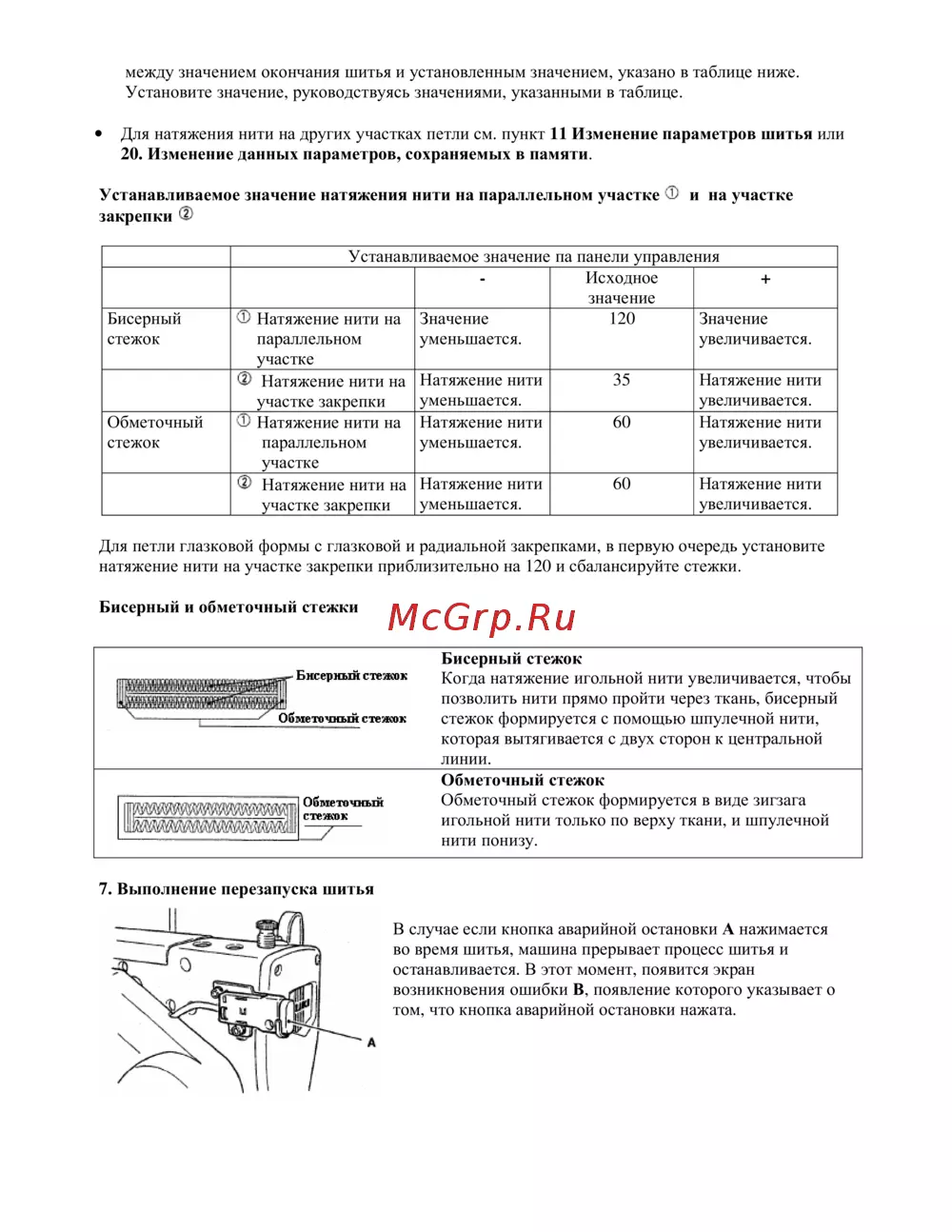 между значением окончания шитья и установленным значением указано в таблице ниже Установите значение руководствуясь значениями указанными в таблице Для натяжения нити на других участках петли см пункт 11 Изменение параметров шитья или 20 Изменение данных параметров сохраняемых в памяти Устанавливаемое значение натяжения нити на параллельном участке Ф и на участке закрепки Ф Бисерный стежок Обметочный стежок Устанавливаемое значение па панели управления Исходное значение Ф Натяжение нити на Значение 120 Значение параллельном уменьшается увеличивается участке Натяжение нити 35 Натяжение нити Натяжение нити на уменьшается увеличивается участке закрепки Ф Натяжение нити на Натяжение нити 60 Натяжение нити параллельном уменьшается увеличивается участке Натяжение нити 60 Натяжение нити Натяжение нити на уменьшается увеличивается участке закрепки Для петли глазковой формы с глазковой и радиальной закрепками в первую очередь установите натяжение нити на участке закрепки приблизительно на 120 и сбалансируйте стежки Бисерный и обметочный стежки Бисерный стежок Обметочный стежок Обметочный стежок Бисерный стежок Когда натяжение игольной нити увеличивается чтобы позволить нити прямо пройти через ткань бисерный стежок формируется с помощью шпулечной нити которая вытягивается с двух сторон к центральной линии Обметочный стежок Обметочный стежок формируется в виде зигзага игольной нити только по верху ткани и шпулечной нити понизу 7 Выполнение перезапуска шитья В случае если кнопка аварийной остановки А нажимается во время шитья машина прерывает процесс шитья и останавливается В этот момент появится экран возникновения ошибки В появление которого указывает о том что кнопка аварийной остановки нажата