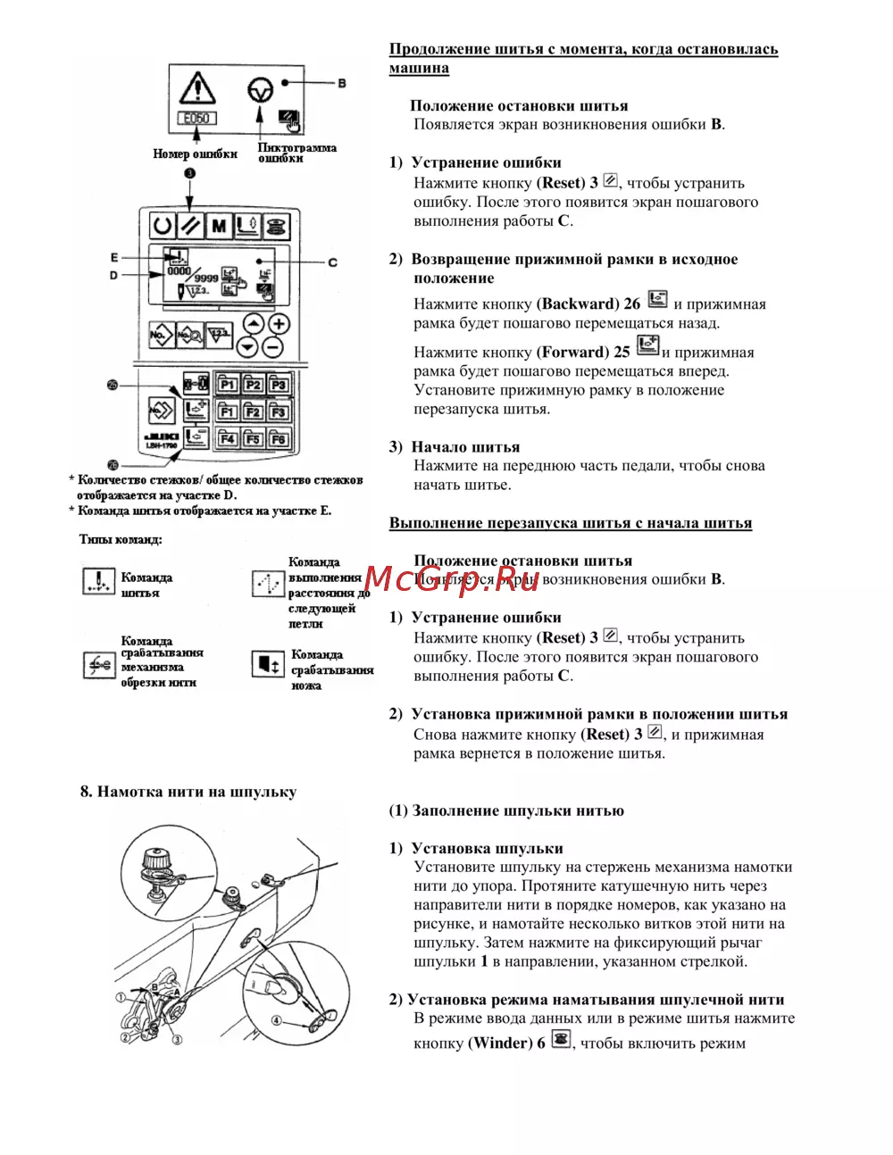 Продолжение шитья с момента когда остановилась машина Положение остановки шитья Появляется экран возникновения ошибки В 1 Устранение ошибки Нажмите кнопку Reset 3 й чтобы устранить ошибку После этого появится экран пошагового выполнения работы С 2 Возвращение прижимной рамки в исходное положение Нажмите кнопку Backward 26 Е и прижимная рамка будет пошагово перемещаться назад Нажмите кнопку Forward 25 и прижимная рамка будет пошагово перемещаться вперед Установите прижимную рамку в положение перезапуска шитья Количество стежков общее количество стежков отображается на участке В Команда шитья отображается на участке Е 3 Начало шитья Нажмите на переднюю часть педали чтобы снова начать шитье Выполнение перезапуска шитья с начала шитья Тилы команд Команда шитья Команда срабатывания механизма обрезки нити Команда выполнения расстояния до следующей петли Команда срабатывания ножа Положение остановки шитья Появляется экран возникновения ошибки В 1 Устранение ошибки Нажмите кнопку Reset 3 I чтобы устранить ошибку После этого появится экран пошагового выполнения работы С 2 Установка прижимной рамки в положении шитья Снова нажмите кнопку Reset 3 й и прижимная рамка вернется в положение шитья 8 Намотка нити на шпульку 1 Заполнение шпульки нитью 1 Установка шпульки Установите шпульку на стержень механизма намотки нити до упора Протяните катушечную нить через направители нити в порядке номеров как указано на рисунке и намотайте несколько витков этой нити на шпульку Затем нажмите на фиксирующий рычаг шпульки 1 в направлении указанном стрелкой 2 Установка режима наматывания шпулечной нити В режиме ввода данных или в режиме шитья нажмите кнопку Winder 6 aj чтобы включить режим