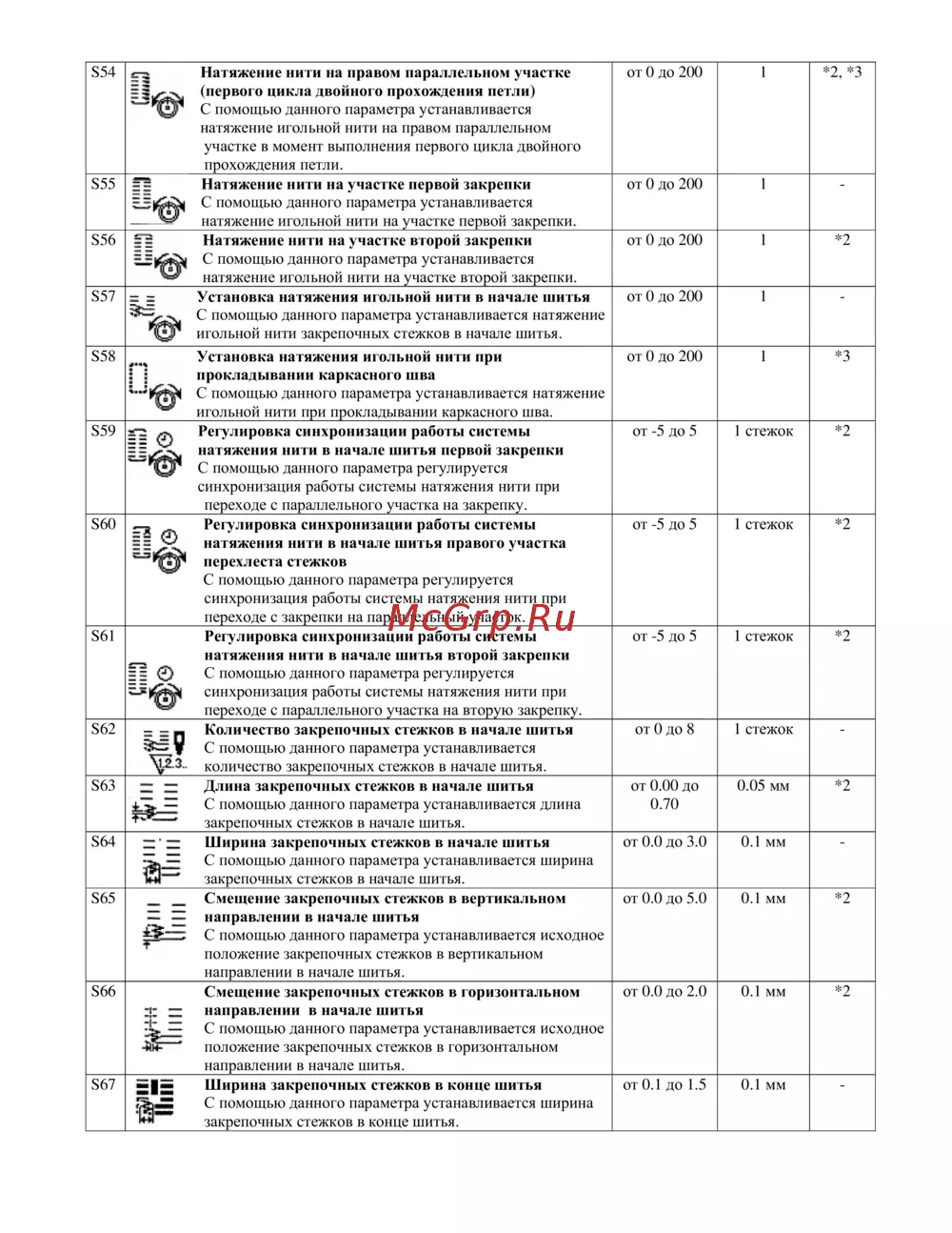 854 855 856 857 858 859 860 861 862 863 864 865 866 867 5 Натяжение нити на правом параллельном участке первого цикла двойного прохождения петли С помощью данного параметра устанавливается натяжение игольной нити на правом параллельном участке в момент выполнения первого цикла двойного прохождения петли Натяжение нити на участке первой закрепки С помощью данного параметра устанавливается натяжение игольной нити на участке первой закрепки Натяжение нити на участке второй закрепки помощью данного параметра устанавливается натяжение игольной нити на участке второй закрепки Установка натяжения игольной нити в начале шитья С помощью данного параметра устанавливается натяжение игольной нити закрепочных стежков в начале шитья Установка натяжения игольной нити при прокладывании каркасного шва помощью данного параметра устанавливается натяжение игольной нити при прокладывании каркасного шва А Регулировка синхронизации работы системы Ё натяжения нити в начале шитья первой закрепки С помощью данного параметра регулируется синхронизация работы системы натяжения нити при переходе с параллельного участка на закрепку Регулировка синхронизации работы системы натяжения нити в начале шитья правого участка перехлеста стежков С помощью данного параметра регулируется синхронизация работы системы натяжения нити при переходе с закрепки на параллельный участок Регулировка синхронизации работы системы натяжения нити в начале шитья второй закрепки Ё Ё 0 С помощью данного параметра регулируется синхронизация работы системы натяжения нити при переходе с параллельного участка на вторую закрепку Количество закрепочных стежков в начале шитья 3 V С помощью данного параметра устанавливается 2 3 количество закрепочных стежков в начале шитья Длина закрепочных стежков в начале шитья С помощью данного параметра устанавливается длина закрепочных стежков в начале шитья X Ширина закрепочных стежков в начале шитья С помощью данного параметра устанавливается ширина закрепочных стежков в начале шитья _ ___ Смещение закрепочных стежков в вертикальном направлении в начале шитья С помощью данного параметра устанавливается исходное положение закрепочных стежков в вертикальном направлении в начале шитья Смещение закрепочных стежков в горизонтальном направлении в начале шитья С помощью данного параметра устанавливается исходное йиположение закрепочных стежков в горизонтальном направлении в начале шитья Ширина закрепочных стежков в конце шитья йз С помощью данного параметра устанавливается ширина закрепочных стежков в конце шитья от 0 до 200 1 2 3 от 0 до 200 1 от 0 до 200 1 2 от 0 до 200 1 от 0 до 200 1 3 от 5 до 5 1 стежок 2 от 5 до 5 1 стежок 2 от 5 до 5 1 стежок 2 от 0 до 8 1 стежок от 0 00 до 0 70 0 05 мм 2 от 0 0 до 3 0 0 1 мм от 0 0 до 5 0 0 1 мм 2 от 0 0 до 2 0 0 1 мм 2 от 0 1 до 1 5 0 1 мм