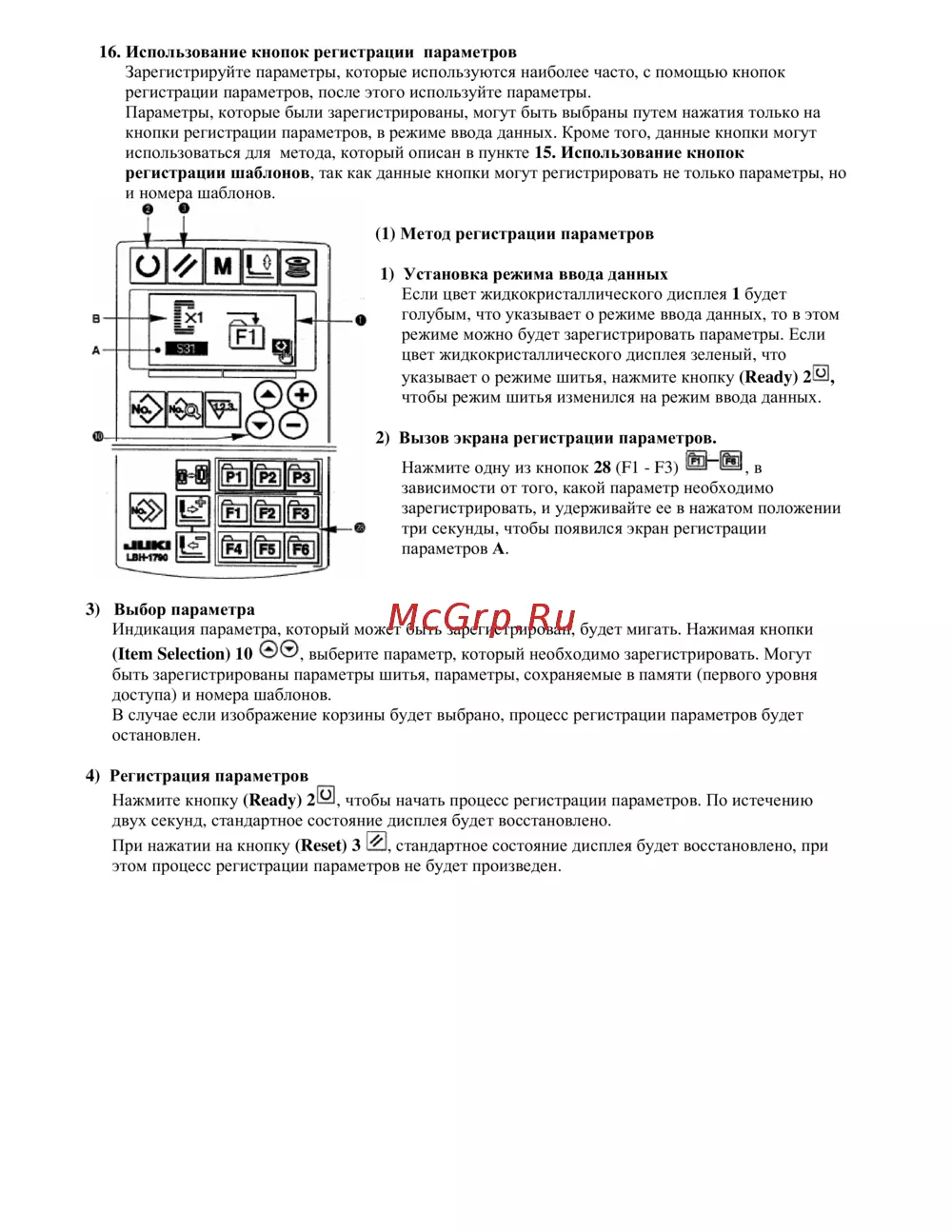 16 Использование кнопок регистрации параметров Зарегистрируйте параметры которые используются наиболее часто с помощью кнопок регистрации параметров после этого используйте параметры Параметры которые были зарегистрированы могут быть выбраны путем нажатия только на кнопки регистрации параметров в режиме ввода данных Кроме того данные кнопки могут использоваться для метода который описан в пункте 15 Использование кнопок регистрации шаблонов так как данные кнопки могут регистрировать не только параметры но и номера шаблонов О 1 Метод регистрации параметров 1 Установка режима ввода данных Если цвет жидкокристаллического дисплея 1 будет голубым что указывает о режиме ввода данных то в этом режиме можно будет зарегистрировать параметры Если цвет жидкокристаллического дисплея зеленый что указывает о режиме шитья нажмите кнопку Ready 20 чтобы режим шитья изменился на режим ввода данных 2 Вызов экрана регистрации параметров Нажмите одну из кнопок 28 Fl F3 в зависимости от того какой параметр необходимо зарегистрировать и удерживайте ее в нажатом положении три секунды чтобы появился экран регистрации параметров А 3 Выбор параметра Индикация параметра который может быть зарегистрирован будет мигать Нажимая кнопки Item Selection 10 выберите параметр который необходимо зарегистрировать Могут быть зарегистрированы параметры шитья параметры сохраняемые в памяти первого уровня доступа и номера шаблонов В случае если изображение корзины будет выбрано процесс регистрации параметров будет остановлен 4 Регистрация параметров Нажмите кнопку Ready 20 чтобы начать процесс регистрации параметров По истечению двух секунд стандартное состояние дисплея будет восстановлено При нажатии на кнопку Reset 3 0 стандартное состояние дисплея будет восстановлено при этом процесс регистрации параметров не будет произведен