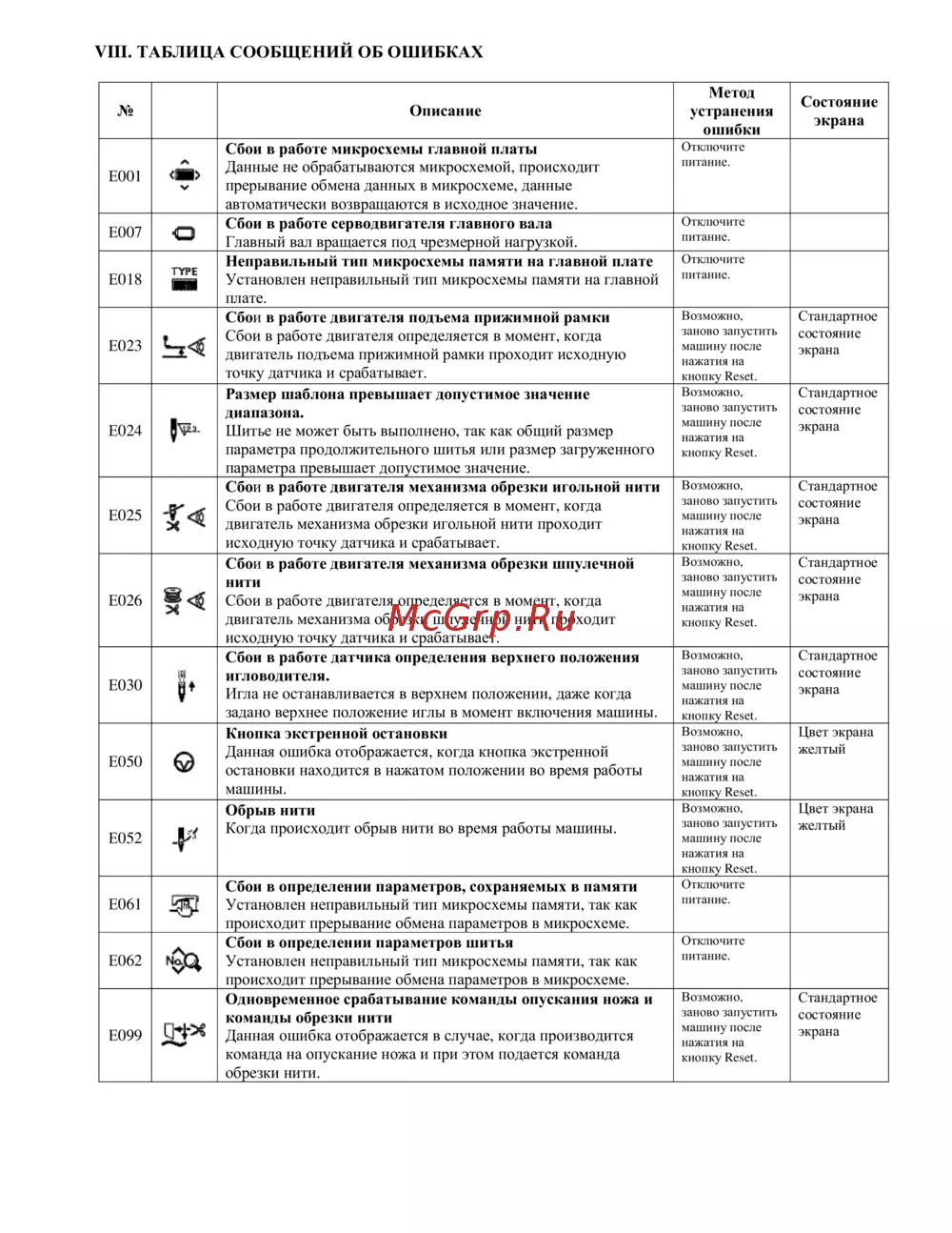 VIII ТАБЛИЦА СООБЩЕНИИ ОБ ОШИБКАХ Описание л Е001 и V Е007 о Е018 TYPE ИЖ Е023 Е024 К А Е025 Е026 ЕОЗО т Е052 О 1 Е050 Е061 Е062 Е099 Сбои в работе микросхемы главной платы Данные не обрабатываются микросхемой происходит прерывание обмена данных в микросхеме данные автоматически возвращаются в исходное значение Сбои в работе серводвигателя главного вала Главный вал вращается под чрезмерной нагрузкой Неправильный тип микросхемы памяти на главной плате Установлен неправильный тип микросхемы памяти на главной плате Сбои в работе двигателя подъема прижимной рамки Сбои в работе двигателя определяется в момент когда двигатель подъема прижимной рамки проходит исходную точку датчика и срабатывает Размер шаблона превышает допустимое значение диапазона Шитье не может быть выполнено так как общий размер параметра продолжительного шитья или размер загруженного параметра превышает допустимое значение Сбои в работе двигателя механизма обрезки игольной нити Сбои в работе двигателя определяется в момент когда двигатель механизма обрезки игольной нити проходит исходную точку датчика и срабатывает Сбои в работе двигателя механизма обрезки шпулечной нити Сбои в работе двигателя определяется в момент когда двигатель механизма обрезки шпулечной нити проходит исходную точку датчика и срабатывает Сбои в работе датчика определения верхнего положения игловодителя Игла не останавливается в верхнем положении даже когда задано верхнее положение иглы в момент включения машины Кнопка экстренной остановки Данная ошибка отображается когда кнопка экстренной остановки находится в нажатом положении во время работы машины Обрыв нити Когда происходит обрыв нити во время работы машины да Сбои в определении параметров сохраняемых в памяти Установлен неправильный тип микросхемы памяти так как происходит прерывание обмена параметров в микросхеме Сбои в определении параметров шитья Установлен неправильный тип микросхемы памяти так как происходит прерывание обмена параметров в микросхеме Одновременное срабатывание команды опускания ножа и команды обрезки нити Данная ошибка отображается в случае когда производится команда на опускание ножа и при этом подается команда обрезки нити Метод устранения ошибки Состояние экрана Отключите питание Отключите питание Отключите питание Возможно заново запустить машину после нажатия на кнопку Reset Возможно заново запустить машину после нажатия на кнопку Reset Стандартное состояние экрана Возможно заново запустить машину после нажатия на кнопку Reset Возможно заново запустить машину после нажатия на кнопку Reset Стандартное состояние экрана Возможно заново запустить машину после нажатия на кнопку Reset Возможно заново запустить машину после нажатия на кнопку Reset Возможно заново запустить машину после нажатия на кнопку Reset Отключите питание Стандартное состояние экрана Стандартное состояние экрана Стандартное состояние экрана Цвет экрана желтый Цвет экрана желтый Отключите питание Возможно заново запустить машину после нажатия на кнопку Reset Стандартное состояние экрана