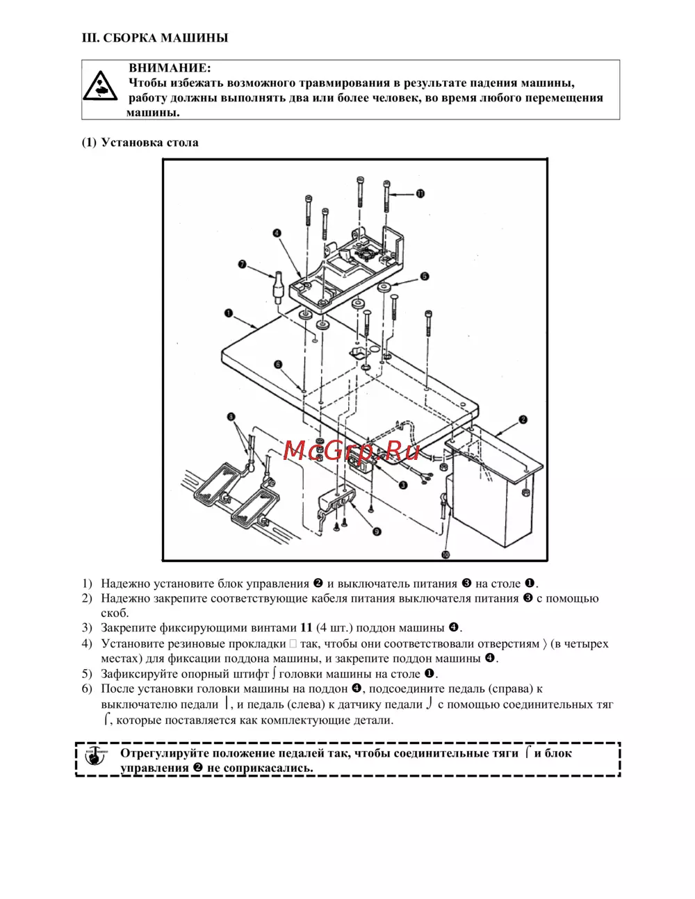 III СБОРКА МАШИНЫ ВНИМАНИЕ Чтобы избежать возможного травмирования в результате падения машины работу должны выполнять два или более человек во время любого перемещения машины 1 Установка стола 1 Надежно установите блок управления и выключатель питания на столе О 2 Надежно закрепите соответствующие кабеля питания выключателя питания с помощью скоб 3 Закрепите фиксирующими винтами 11 4 шт поддон машины О 4 Установите резиновые прокладки так чтобы они соответствовали отверстиям в четырех местах для фиксации поддона машины и закрепите поддон машины О 5 Зафиксируйте опорный штифт I головки машины на столе О 6 После установки головки машины на поддон О подсоедините педаль справа к выключателю педали и педаль слева к датчику педали J с помощью соединительных тяг Г которые поставляется как комплектующие детали Отрегулируйте положение педалей так чтобы соединительные тяги Г и блок I I управления не соприкасались