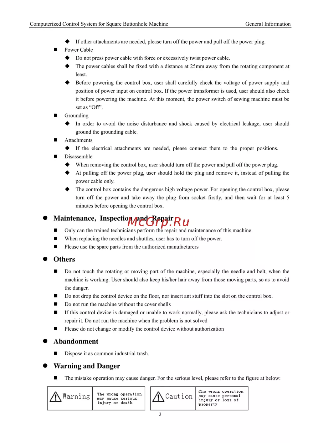 - Safety matters for attention computerized control system for square buttonhole machine p.6