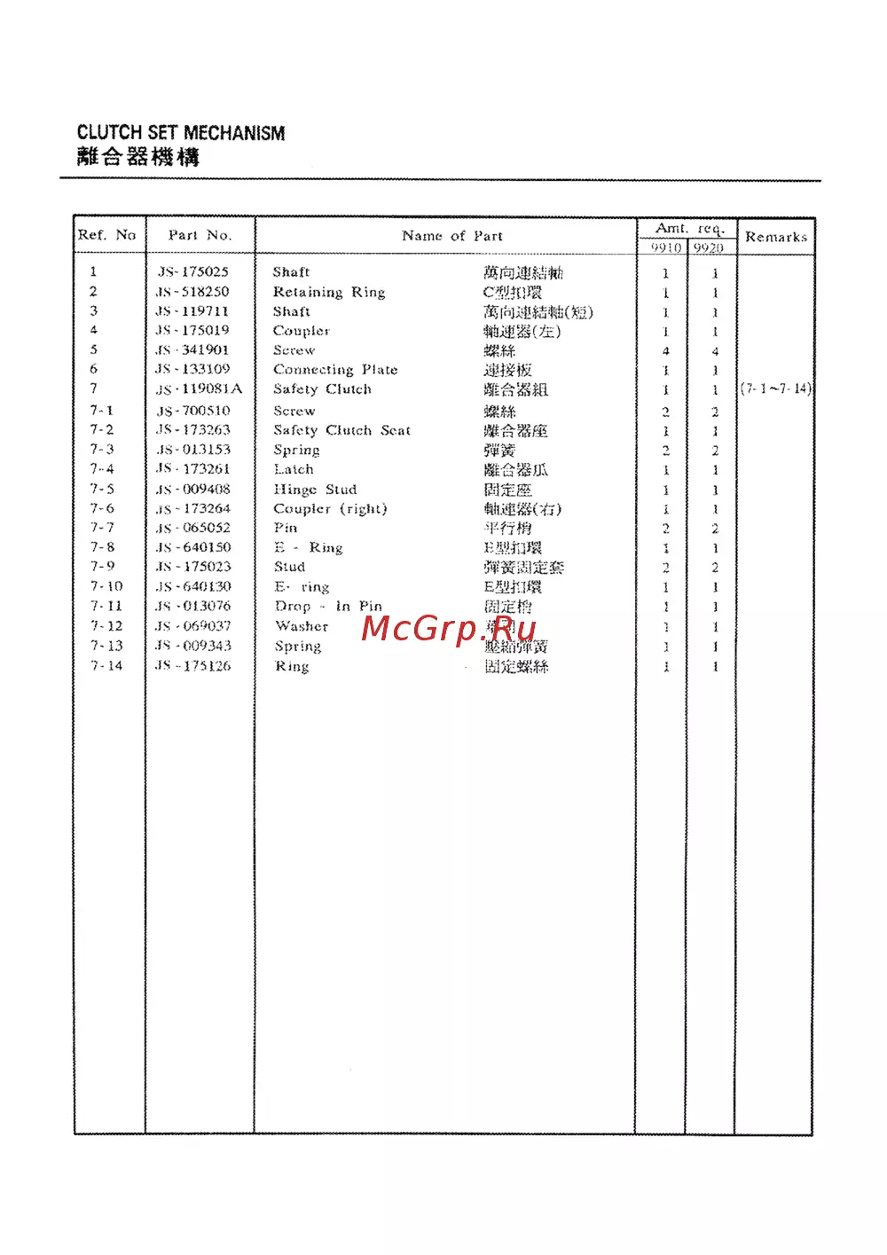 CLUTCH SET MECHANISM Ref No Part No 1 2 3 4 5 6 7 JS 175025 3 8 518250 IS 119711 JS 175019 JS 341901 38 133109 j 119081A Shaft 7 1 7 2 7 3 7 4 7 5 7 6 7 7 7 8 7 9 7 W 7 11 742 7 13 7 14 J8 7O05W 38 173263 JS 013153 JS 173261 JS 009408 JS 173264 J S 065052 JS 640150 JS 175023 JS 640130 JS 013076 JS 069037 JS 009343 is 175126 Screw Safety Clutch Scat Spring Latch Hinge Stud Coupler right Pin E Ring Stud E ring Drop in Pin Washer Spring Ring Name of Part Retaining Ring Shaft Coupler Screw Connecting Plate Safety Clutch c MiWOb W wim Amt req 9910 99 B 1 1 1 I 4 1 1 2 1 1 1 1 4 1 I 2 1 7 J 1 1 1 7 1 1 1 2 1 2 1 1 1 1 1 4 EWjm 1 sc l A A Remarks 7 1 7 14