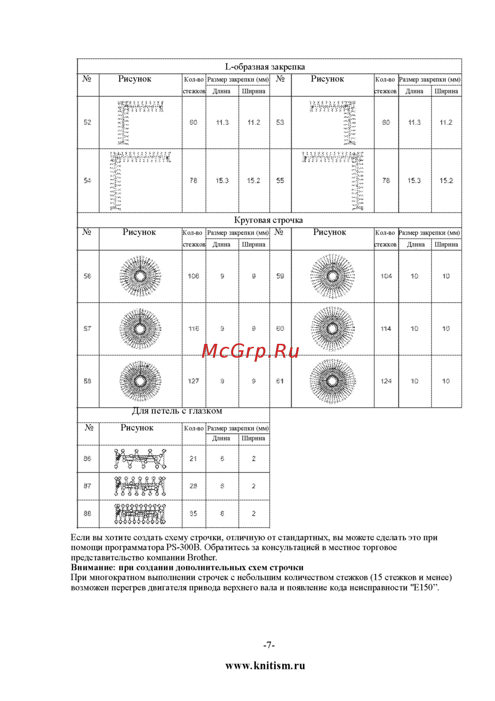 L образная закрепка Рисунок Кол во Размер закрепки мм стежков Рисунок Кол во Размер закрепки мм Длина Ширина л ежков Длина Ширина its 11 2 Й 11 2 11 2 8 15 з 15 2 5 s а 15 2 55 Круговая строчка Рисунок Длина Ширина 188 8 3 Рисунок Кол во азмер закрепки мм л ежков 59 Длина Ширина 18 10 Ш 10 ТО 124 10 18 ЧА se Кол во Размер закрепки мм стежков ЖЖ х g Tic 127 о л 1 для петель с глазком Рисунок 21 ft шар 28 2 ИШЙЬш 28 8 2 А Кол во Размер закрепки мм Длина Ширина Если вы хотите создать схему строчки отличную от стандартных вы можете сделать это при помощи программатора PS 300B Обратитесь за консультацией в местное торговое представительство компании Brother Внимание при создании дополнительных схем строчки При многократном выполнении строчек с небольшим количеством стежков 15 стежков и менее возможен перегрев двигателя привода верхнего вала и появление кода неисправности Е150 www knitism ru