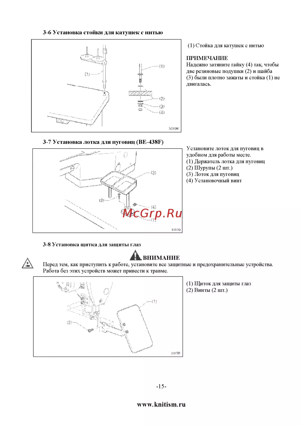 3 6 Установка стойки для катушек с нитью 1 Стойка для катушек с нитью ПРИМЕЧАНИЕ Надежно затяните гайку 4 так чтобы две резиновые подушки 2 и шайба 3 были плотно зажаты и стойка 1 не двигалась 3 7 Установка лотка для пуговиц ВЕ 438Е Установите лоток для пуговиц в удобном для работы месте 1 Держатель лотка для пуговиц 2 Шурупы 2 шт 3 Лоток для пуговиц 4 Установочный винт 3 8 Установка щитка для защиты глаз А ВНИМАНИЕ Перед тем как приступить к работе установите все защитные и предохранительные устройства Работа без этих устройств может привести к травме 15 www knitism ru