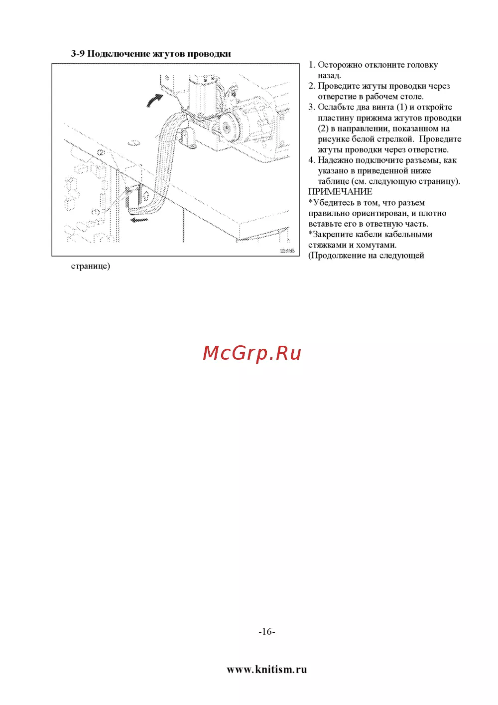 3 9 Подключение жгутов проводки 1 Осторожно отклоните головку назад 2 Проведите жгуты проводки через отверстие в рабочем столе 3 Ослабьте два винта 1 и откройте пластину прижима жгутов проводки 2 в направлении показанном на рисунке белой стрелкой Проведите жгуты проводки через отверстие 4 Надежно подключите разъемы как указано в приведенной ниже таблице см следующую страницу ПРИМЕЧАНИЕ Убедитесь в том что разъем правильно ориентирован и плотно вставьте его в ответную часть 3акрепите кабели кабельными стяжками и хомутами Продолжение на следующей 16 www knitism ru