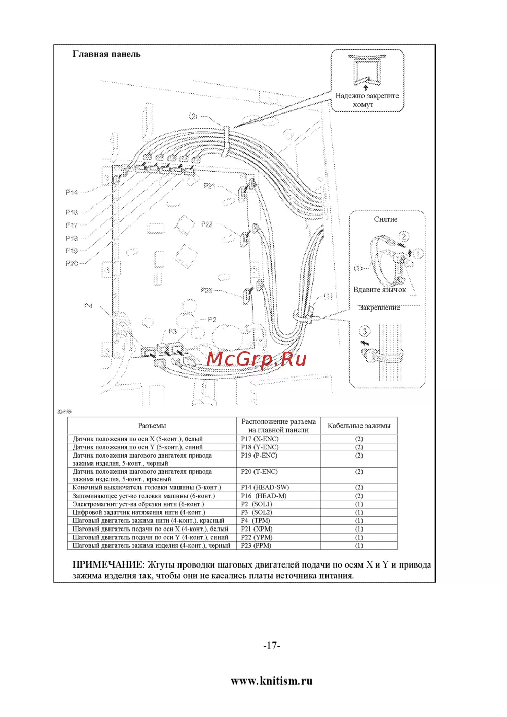 Разъемы Датчик положения по оси X 5 конт белый Датчик положения по оси У 5 конт синий Датчик положения шагового двигателя привода зажима изделия 5 конт черный Датчик положения шагового двигателя привода зажима изделия 5 конт красный Конечный выключатель головки машины 3 конт Запоминающее уст во головки машины 6 конт Электромагнит уст ва обрезки нити 6 конт Цифровой задатчик натяжения нити 4 конт Шаговый двигатель зажима нити 4 конт красный Шаговый двигатель подачи по оси X 4 конт белый Шаговый двигатель подачи по оси У 4 конт синий Шаговый двигатель зажима изделия 4 конт черный Расположение разъема на главной панели Р17 X ENC Р18 Y ENC Р19 P ENC Кабельные зажимы 2 2 2 Р20 T ENC 2 Р14 HEAD SW Р16 HEAD M Р2 SOLI РЗ SOL2 Р4 ТРМ Р21 ХРМ Р22 YPM Р23 PPM 2 2 1 1 1 1 1 1 ПРИМЕЧАНИЕ Жгуты проводки шаговых двигателей подачи по осям Хи У и привода зажима изделия так чтобы они не касались платы источника питания 17 www knitism ru