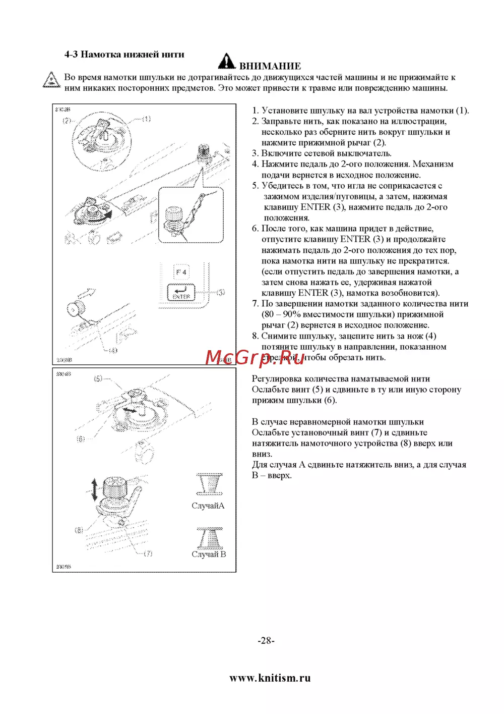 4 3 Намотка нижней нити ВНИМАНИЕ XX Во время намотки шпульки не дотрагивайтесь до движущихся частей машины и не прижимайте к т х ним никаких посторонних предметов Это может привести к травме или повреждению машины 1 Установите шпульку на вал устройства намотки 1 2 Заправьте нить как показано на иллюстрации несколько раз оберните нить вокруг шпульки и нажмите прижимной рычаг 2 3 Включите сетевой выключатель 4 Нажмите педаль до 2 ого положения Механизм подачи вернется в исходное положение 5 Убедитесь в том что игла не соприкасается с зажимом изделия пуговицы а затем нажимая клавишу ENTER 3 нажмите педаль до 2 ого положения 6 После того как машина придет в действие отпустите клавишу ENTER 3 и продолжайте нажимать педаль до 2 ого положения до тех пор пока намотка нити на шпульку не прекратится если отпустить педаль до завершения намотки а затем снова нажать ее удерживая нажатой клавишу ENTER 3 намотка возобновится 7 По завершении намотки заданного количества нити 80 90 вместимости шпульки прижимной рычаг 2 вернется в исходное положение 8 Снимите шпульку зацепите нить за нож 4 потяните шпульку в направлении показанном стрелкой чтобы обрезать нить Регулировка количества наматываемой нити Ослабьте винт 5 и сдвиньте в ту или иную сторону прижим шпульки 6 В случае неравномерной намотки шпульки Ослабьте установочный винт 7 и сдвиньте натяжитель намоточного устройства 8 вверх или вниз Для случая А сдвиньте натяжитель вниз а для случая В вверх 28 www knitism ru