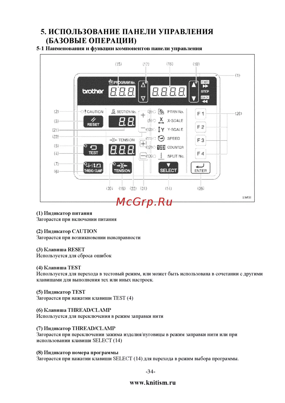 5 ИСПОЛЬЗОВАНИЕ ПАНЕЛИ УПРАВЛЕНИЯ БАЗОВЫЕ ОПЕРАЦИИ 5 1 Наименования и функции компонентов панели управления 1 Индикатор питания Загорается при включении питания 2 Индикатор CAUTION Загорается при возникновении неисправности 3 Клавиша RESET Используется для сброса ошибок 4 Клавиша TEST Используется для перехода в тестовый режим или может быть использована в сочетании с другими клавишами для выполнения тех или иных настроек 5 Индикатор TEST Загорается при нажатии клавиши TEST 4 6 Клавиша THREAD CLAMP Используется для переключения в режим заправки нити 7 Индикатор THREAD CLAMP Загорается при переключении зажима изделия пуговицы в режим заправки нити или при использовании клавиши SELECT 14 8 Индикатор номера программы Загорается при нажатии клавиши SELECT 14 для перехода в режим выбора программы 34 www knitism ru