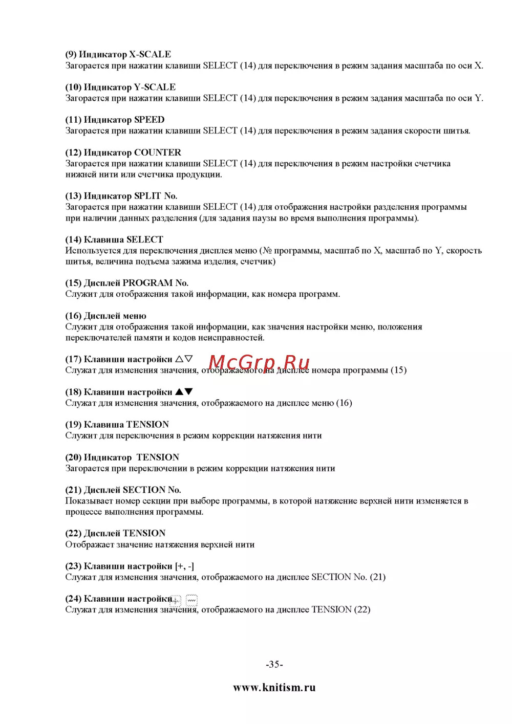 9 Индикатор X SCALE Загорается при нажатии клавиши SELECT 14 для переключения в режим задания масштаба по оси X 10 Индикатор Y SCALE Загорается при нажатии клавиши SELECT 14 для переключения в режим задания масштаба по оси Y 11 Индикатор SPEED Загорается при нажатии клавиши SELECT 14 для переключения в режим задания скорости шитья 12 Индикатор COUNTER Загорается при нажатии клавиши SELECT 14 для переключения в режим настройки счетчика нижней нити или счетчика продукции 13 Индикатор SPLIT No Загорается при нажатии клавиши SELECT 14 для отображения настройки разделения программы при наличии данных разделения для задания паузы во время выполнения программы 14 Клавиша SELECT Используется для переключения дисплея меню программы масштаб по X масштаб по Y скорость шитья величина подъема зажима изделия счетчик 15 Дисплей PROGRAM No Служит для отображения такой информации как номера программ 16 Дисплей меню Служит для отображения такой информации как значения настройки меню положения переключателей памяти и кодов неисправностей 17 Клавиши настройки AV Служат для изменения значения отображаемого на дисплее номера программы 15 18 Клавиши настройки AV Служат для изменения значения отображаемого на дисплее меню 16 19 Клавиша TENSION Служит для переключения в режим коррекции натяжения нити 20 Индикатор TENSION Загорается при переключении в режим коррекции натяжения нити 21 Дисплей SECTION No Показывает номер секции при выборе программы в которой натяжение верхней нити изменяется в процессе выполнения программы 22 Дисплей TENSION Отображает значение натяжения верхней нити 23 Клавиши настройки Служат для изменения значения отображаемого на дисплее SECTION No 21 24 Клавиши настройки Служат для изменения значения отображаемого на дисплее TENSION 22 35 www knitism ru