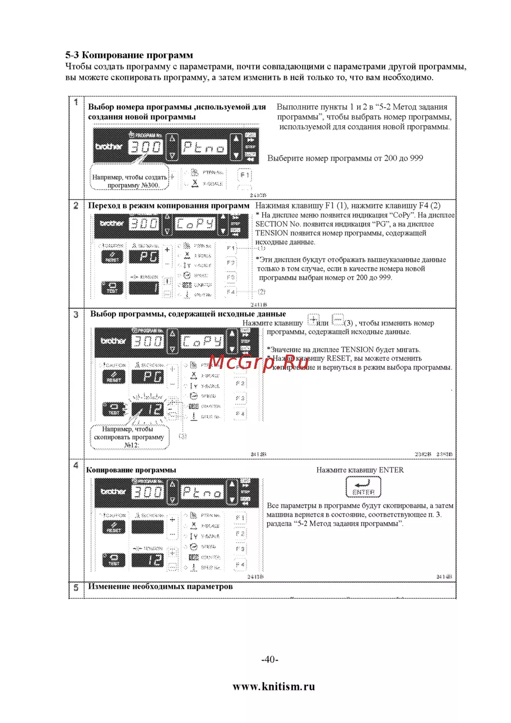 5 3 Копирование программ Чтобы создать программу с параметрами почти совпадающими с параметрами другой программы вы можете скопировать программу а затем изменить в ней только то что вам необходимо 1 Выполните пункты 1 и 2 в 5 2 Метод задания программы чтобы выбрать номер программы используемой для создания новой программы Выбор номера программы используемой для создания новой программы bother п п WU Р b л Выберите номер программы от 200 до 999 Например чтобы создать программу 300 у Переход в режим копирования программ Нажимая клавишу Р1 1 нажмите клавишу Р4 2 На дисплее меню появится индикация СоРу На дисплее ЪдеМ л SECTION No появится индикация PG а на дисплее TENSION появится номер программы содержащей исходные данные Эти дисплеи букдут отображать вышеуказанные данные только в том случае если в качестве номера новой программы выбран номер от 200 до 999 3 Выбор программы содержащей исходные данные 8СЗЗ bcther Нажмите клавишу Сл или 3 чтобы изменить номер программы содержащей исходные данные 3ПП б 3начение на дисплее TENSION будет мигать Нажав клавишу RESET вы можете отменить копирование и вернуться в режим выбора программы Например чтобы скопировать программу I 12 4 Нажмите клавишу ENTER Копирование программы Все параметры в программе будут скопированы а затем машина вернется в состояние соответствующее и 3 раздела 5 2 Метод задания программы Изменение необходимых параметров 40 www knitism ru