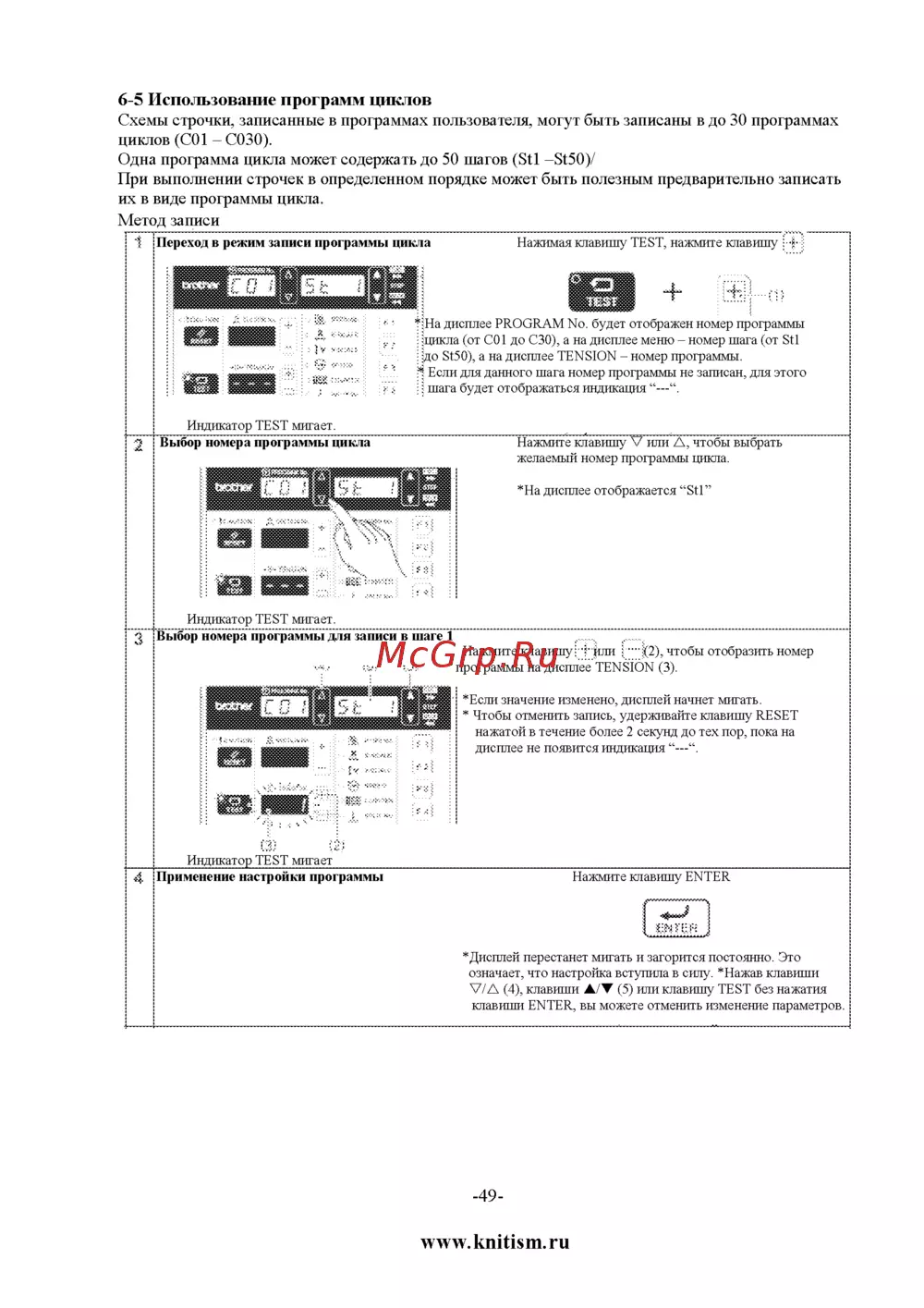 6 5 Использование программ циклов Схемы строчки записанные в программах пользователя могут быть записаны в до 30 программах циклов С01 С030 Одна программа цикла может содержать до 50 шагов 811 8150 При выполнении строчек в определенном порядке может быть полезным предварительно записать их в виде программы цикла Метод записи i Переход в режим записи программы цикла Нажимая клавишу TEST нажмите клавишу tiHa дисплее PROGRAM No будет отображен номер программы цикла от СО 1 до СЗО а на дисплее меню номер шага от St 1 i до St50 а на дисплее TENSION номер программы Если для данного шага номер программы не записан для этого шага будет отображаться индикация Индикатор TEST мигает Выбор номера программы цикла Нажмите клавишу V или чтобы выбрать желаемый номер программы цикла На дисплее отображается БН i Индикатор TEST мигает Выбор номера программы для записи в шаге I Нажмите клавишу или 2 чтобы отобразить номер программы на дисплее TENSION 3 Если значение изменено дисплей начнет мигать Чтобы отменить запись удерживайте клавишу RESET нажатой в течение более 2 секунд до тех пор пока на дисплее не появится индикация 4 Индикатор TEST мигает__________ Применение настройки программы Нажмите клавишу ENTER Дисплей перестанет мигать и загорится постоянно Это означает что настройка вступила в силу Нажав клавиши V A 4 клавиши A V 5 или клавишу TEST без нажатия клавиши ENTER вы можете отменить изменение параметров 49 www knitism ru
