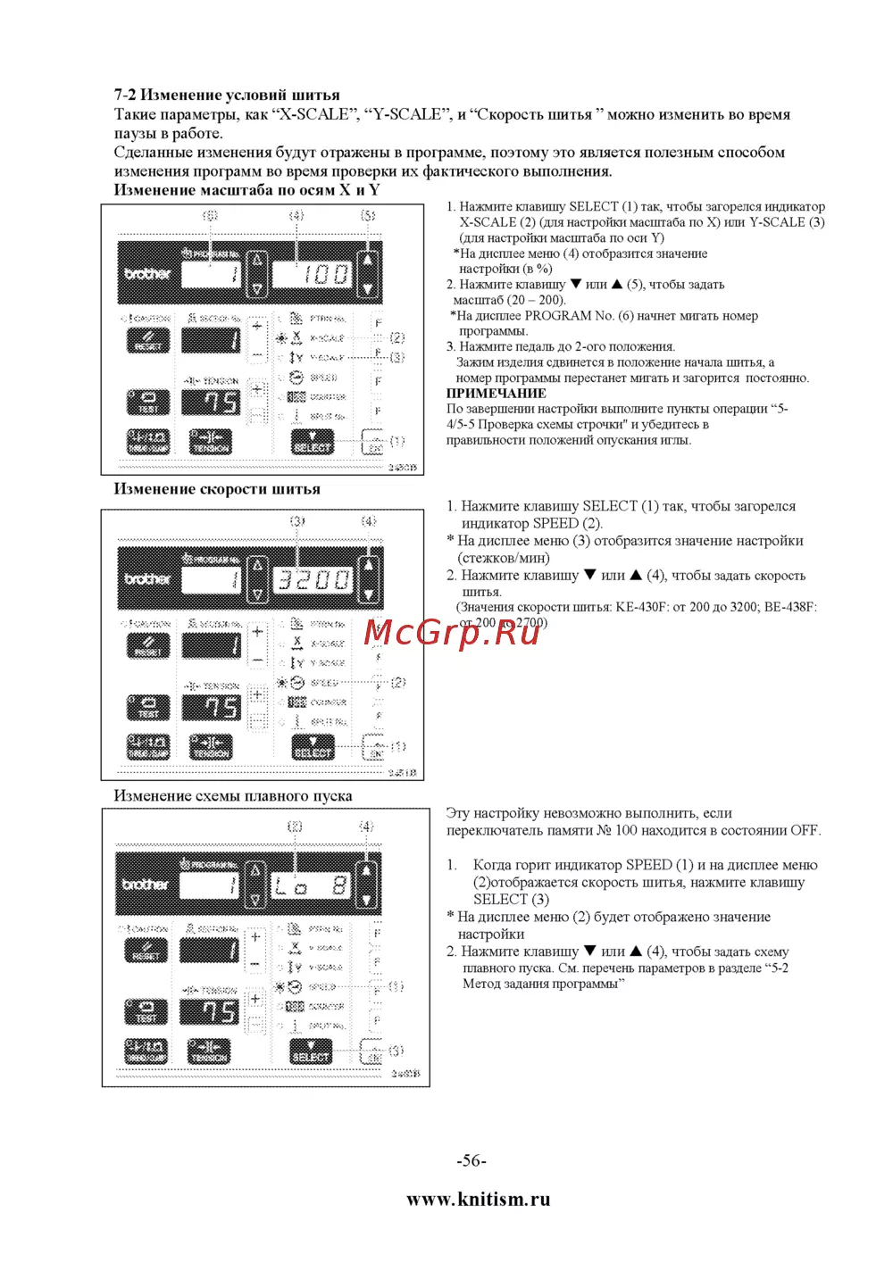 7 2 Изменение условий шитья Такие параметры как X SCALE Y SCALE и Скорость шитья можно изменить во время паузы в работе Сделанные изменения будут отражены в программе поэтому это является полезным способом изменения программ во время проверки их фактического выполнения Изменение масштаба по осям X и Y 1 Нажмите клавишу SELECT 1 так чтобы загорелся индикатор X SCALE 2 для настройки масштаба по X или Y SCALE 3 для настройки масштаба по оси Y На дисплее меню 4 отобразится значение настройки в 2 Нажмите клавишу или 5 чтобы задать масштаб 20 200 На дисплее PROGRAM No 6 начнет мигать номер программы 3 Нажмите педаль до 2 ого положения Зажим изделия сдвинется в положение начала шитья а номер программы перестанет мигать и загорится постоянно ПРИМЕЧАНИЕ По завершении настройки выполните пункты операции 54 5 5 Проверка схемы строчки и убедитесь в правильности положений опускания иглы Изменение скорости шитья 1 Нажмите клавишу SELECT 1 так чтобы загорелся индикатор SPEED 2 На дисплее меню 3 отобразится значение настройки стежков мин 2 Нажмите клавишу или 4 чтобы задать скорость шитья Значения скорости шитья KE 430F от 200 до 3200 BE 438F от 200 до 2700 Изменение схемы плавного пуска Эту настройку невозможно выполнить если переключатель памяти 100 находится в состоянии OFF 1 Когда горит индикатор SPEED 1 и на дисплее меню 2 отображается скорость шитья нажмите клавишу SELECT 3 На дисплее меню 2 будет отображено значение настройки 2 Нажмите клавишу или 4 чтобы задать схему плавного пуска См перечень параметров в разделе 5 2 Метод задания программы 56 www knitism ru