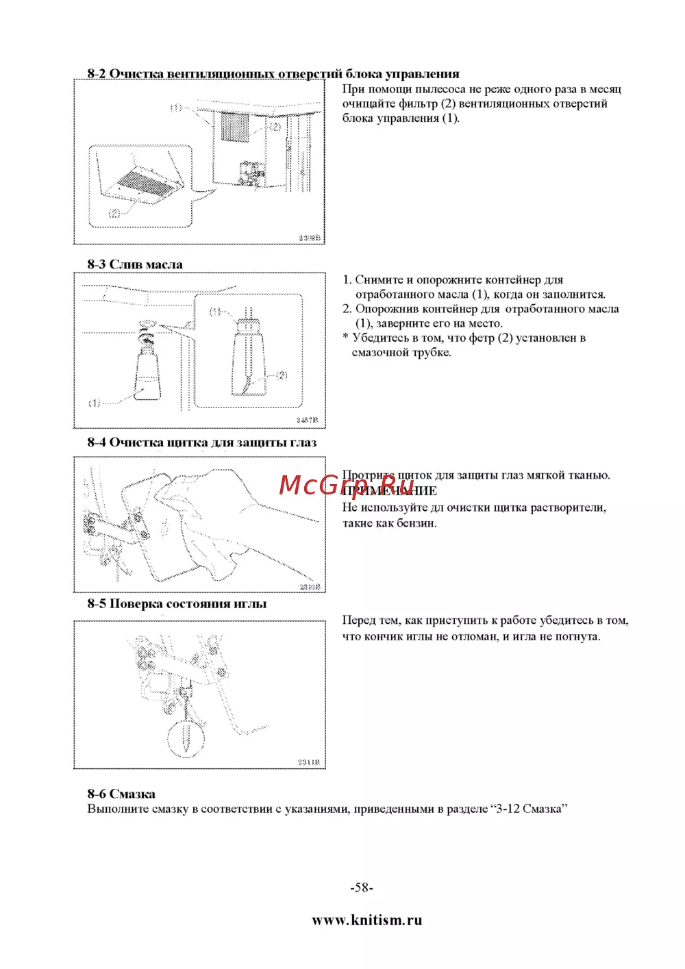 8 2 Очистка вентиляционных отверстий блока управления При помощи пылесоса не реже одного раза в месяц очищайте фильтр 2 вентиляционных отверстий блока управления 1 1 Снимите и опорожните контейнер для отработанного масла 1 когда он заполнится 2 Опорожнив контейнер для отработанного масла 1 заверните его на место Убедитесь в том что фетр 2 установлен в смазочной трубке 8 4 Очистка щитка для защиты глаз Протрите щиток для защиты глаз мягкой тканью ПРИМЕЧАНИЕ Не используйте дл очистки щитка растворители такие как бензин 8 5 Поверка состояния иглы Перед тем как приступить к работе убедитесь в том что кончик иглы не отломан и игла не погнута 8 6 Смазка Выполните смазку в соответствии с указаниями приведенными в разделе 3 12 Смазка 58 www knitism ru