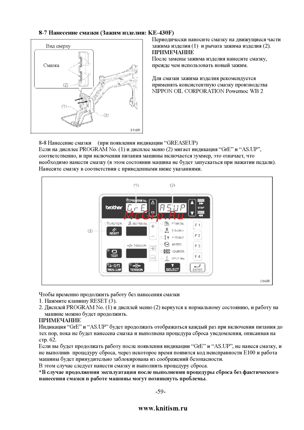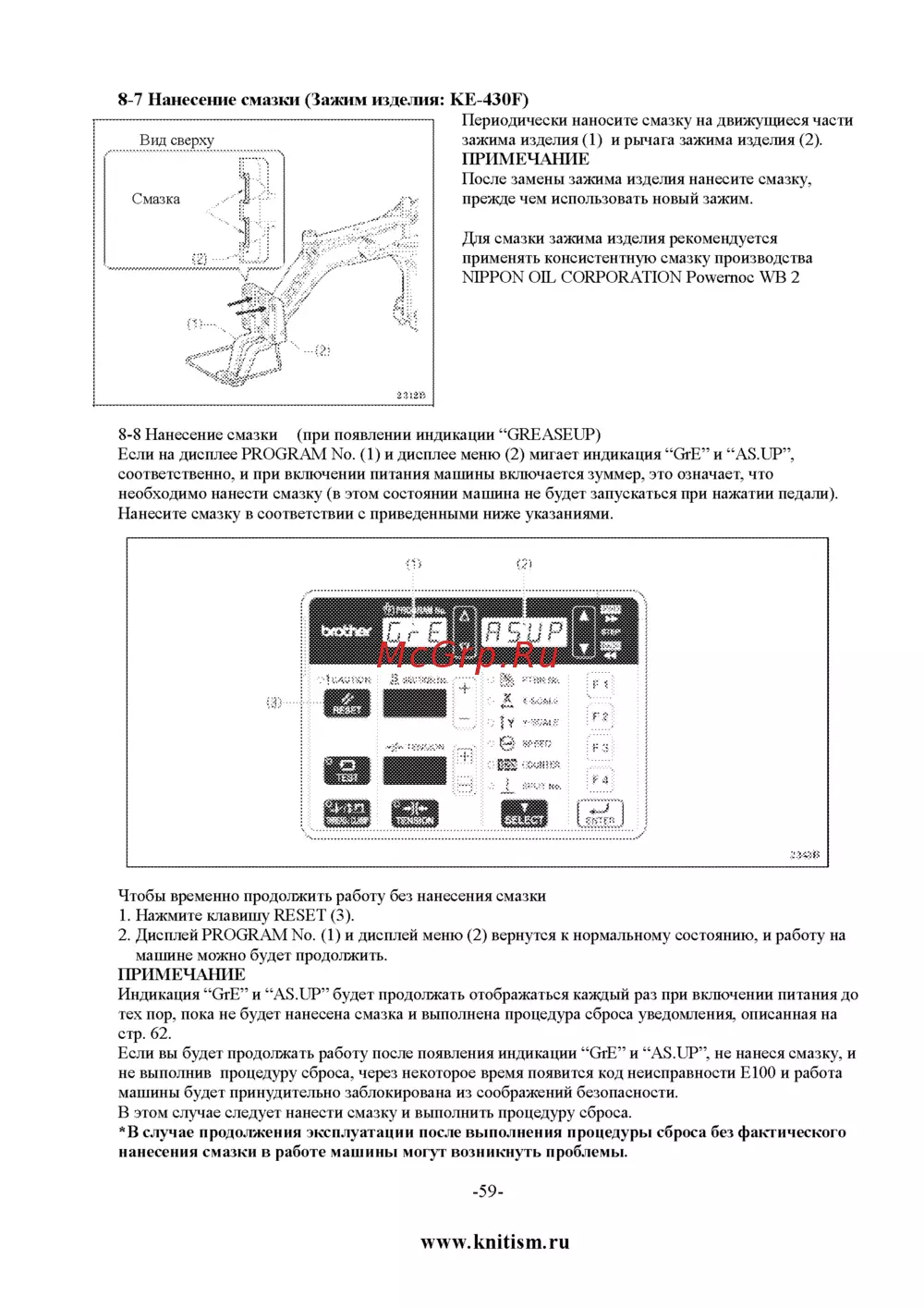 8 7 Нанесение смазки Зажим изделия KE 430F Периодически наносите смазку на движущиеся части зажима изделия 1 и рычага зажима изделия 2 ПРИМЕЧАНИЕ После замены зажима изделия нанесите смазку прежде чем использовать новый зажим Для смазки зажима изделия рекомендуется применять консистентную смазку производства NIPPON OIL CORPORATION Powemoc WB 2 8 8 Нанесение смазки при появлении индикации GREASEUP Если на дисплее PROGRAM No 1 и дисплее меню 2 мигает индикация GrE и AS UP соответственно и при включении питания машины включается зуммер это означает что необходимо нанести смазку в этом состоянии машина не будет запускаться при нажатии педали Нанесите смазку в соответствии с приведенными ниже указаниями Чтобы временно продолжить работу без нанесения смазки 1 Нажмите клавишу RESET 3 2 Дисплей PROGRAM No 1 и дисплей меню 2 вернутся к нормальному состоянию и работу на машине можно будет продолжить ПРИМЕЧАНИЕ Индикация GrE и AS UP будет продолжать отображаться каждый раз при включении питания до тех пор пока не будет нанесена смазка и выполнена процедура сброса уведомления описанная на стр 62 Если вы будет продолжать работу после появления индикации GrE и AS UP не нанеся смазку и не выполнив процедуру сброса через некоторое время появится код неисправности Е100 и работа машины будет принудительно заблокирована из соображений безопасности В этом случае следует нанести смазку и выполнить процедуру сброса В случае продолжения эксплуатации после выполнения процедуры сброса без фактического нанесения смазки в работе машины могут возникнуть проблемы 59 www knitism ru