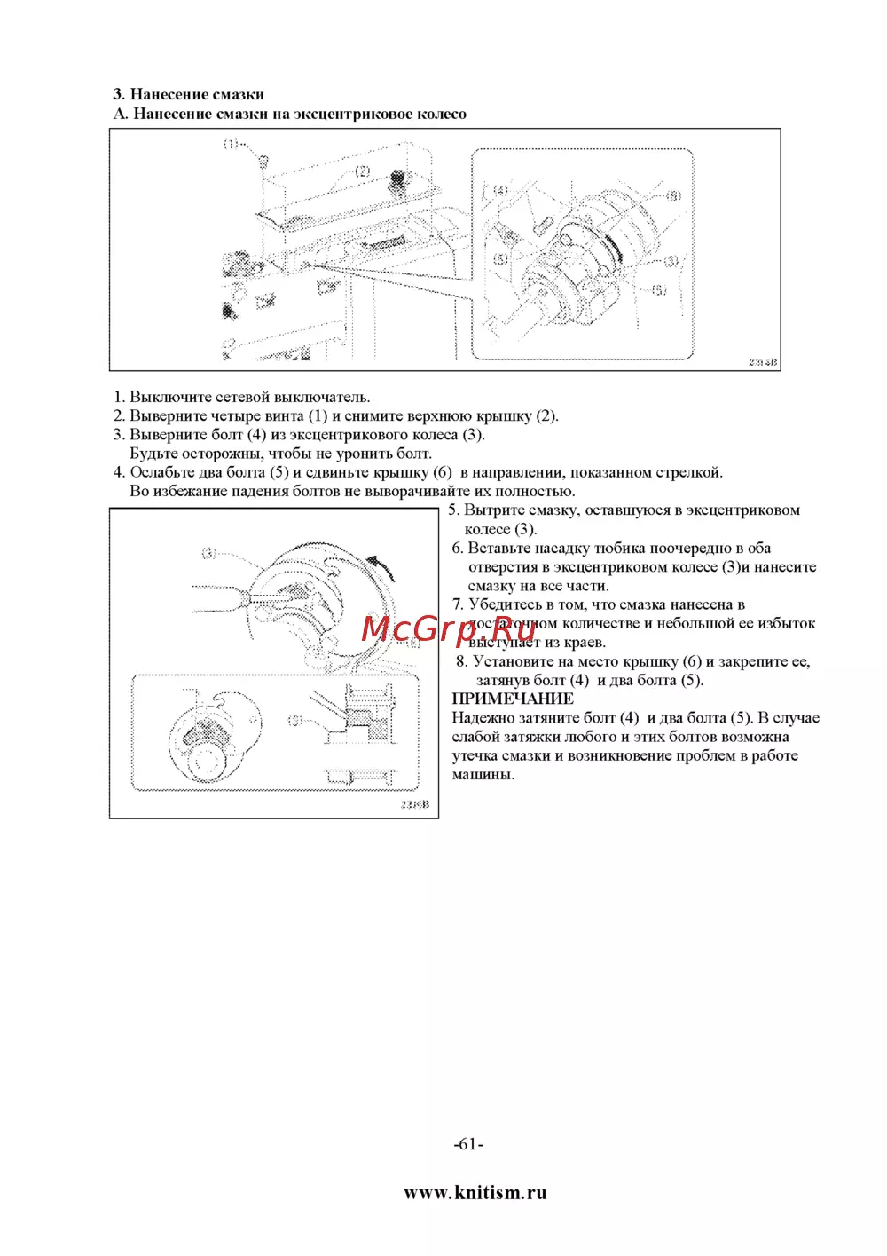 3 Нанесение смазки 1 Выключите сетевой выключатель 2 Выверните четыре винта 1 и снимите верхнюю крышку 2 3 Выверните болт 4 из эксцентрикового колеса 3 Будьте осторожны чтобы не уронить болт 4 Ослабьте два болта 5 и сдвиньте крышку 6 в направлении показанном стрелкой Во избежание падения болтов не выворачивайте их полностью 5 Вытрите смазку оставшуюся в эксцентриковом колесе 3 6 Вставьте насадку тюбика поочередно в оба отверстия в эксцентриковом колесе 3 и нанесите смазку на все части 7 Убедитесь в том что смазка нанесена в достаточном количестве и небольшой ее избыток выступает из краев 8 Установите на место крышку 6 и закрепите ее затянув болт 4 и два болта 5 ПРИМЕЧАНИЕ Надежно затяните болт 4 и два болта 5 В случае слабой затяжки любого и этих болтов возможна утечка смазки и возникновение проблем в работе машины 61 www knitism ru