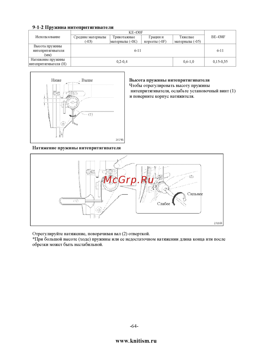 9 1 2 Пружина нитепритягивателя Использование Высота пружины нитепритягивателя мм Натяжение пружины нитепритягивателя Н Средние материалы 03 КЕ 430Е Трикотажные Грации и материалы 0К корсеты 0Р Тяжелые материалы 05 6 11 0 2 0 4 ВЕ 438Е 6 11 0 6 1 0 0 15 0 35 Высота пружины нитепритягивателя Чтобы отрегулировать высоту пружины нитепритягивателя ослабьте установочный винт 1 и поверните корпус натяжителя Отрегулируйте натяжение поворачивая вал 2 отверткой При большой высоте ходе пружины или ее недостаточном натяжении длина конца нти после обрезки может быть нестабильной 64 www knitism ru