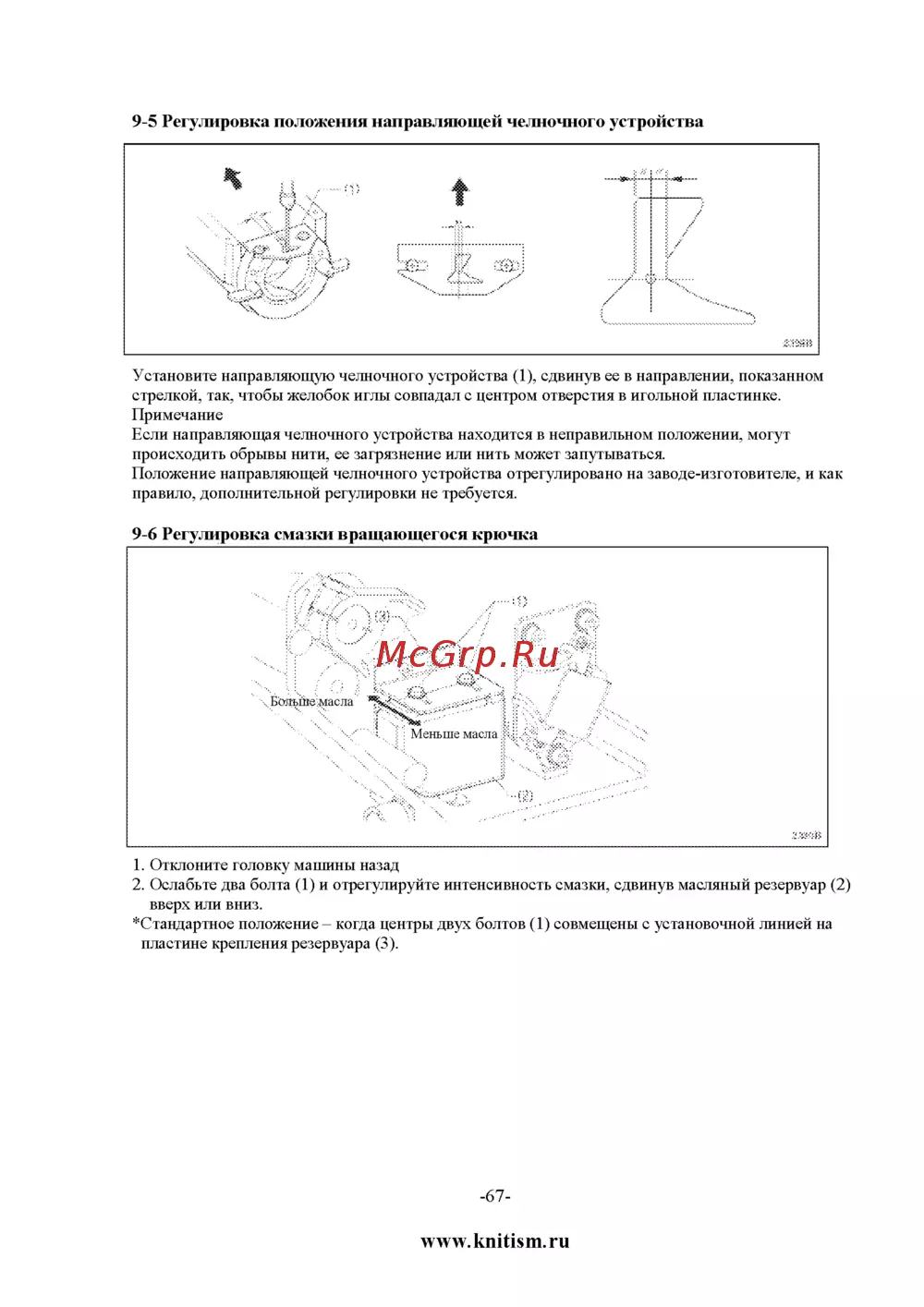 9 5 Регулировка положения направляющей челночного устройства Установите направляющую челночного устройства 1 сдвинув ее в направлении показанном стрелкой так чтобы желобок иглы совпадал с центром отверстия в игольной пластинке Примечание Если направляющая челночного устройства находится в неправильном положении могут происходить обрывы нити ее загрязнение или нить может запутываться Положение направляющей челночного устройства отрегулировано на заводе изготовителе и как правило дополнительной регулировки не требуется 1 Отклоните головку машины назад 2 Ослабьте два болта 1 и отрегулируйте интенсивность смазки сдвинув масляный резервуар 2 вверх или вниз Стандартное положение когда центры двух болтов 1 совмещены с установочной линией на пластине крепления резервуара 3 67 www knitism ru