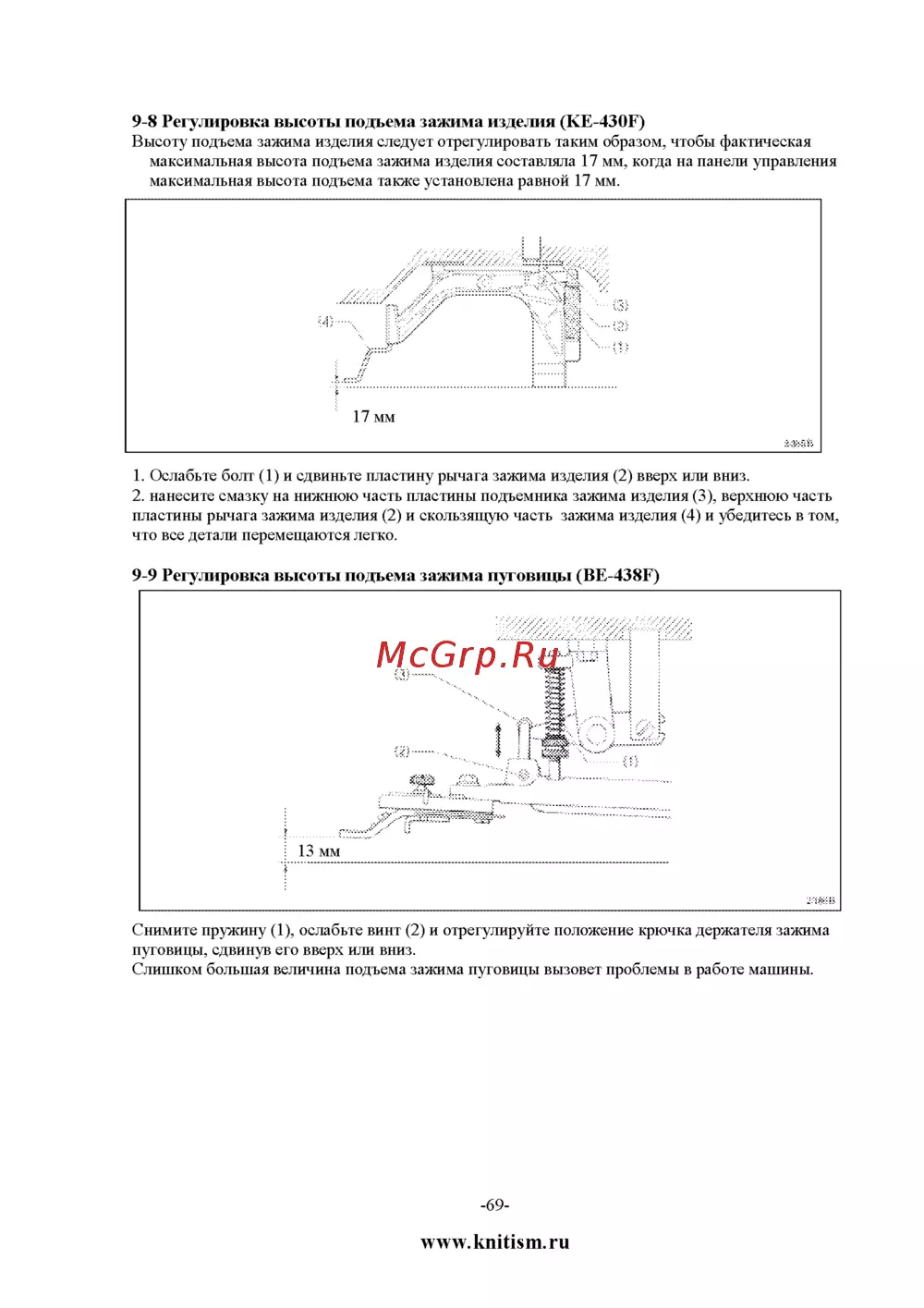 9 8 Регулировка высоты подъема зажима изделия КЕ 430Е Высоту подъема зажима изделия следует отрегулировать таким образом чтобы фактическая максимальная высота подъема зажима изделия составляла 17 мм когда на панели управления максимальная высота подъема также установлена равной 17 мм 1 Ослабьте болт 1 и сдвиньте пластину рычага зажима изделия 2 вверх или вниз 2 нанесите смазку на нижнюю часть пластины подъемника зажима изделия 3 верхнюю часть пластины рычага зажима изделия 2 и скользящую часть зажима изделия 4 и убедитесь в том что все детали перемещаются легко 9 9 Регулировка высоты подъема зажима пуговицы ВЕ 438Е Снимите пружину 1 ослабьте винт 2 и отрегулируйте положение крючка держателя зажима пуговицы сдвинув его вверх или вниз Слишком большая величина подъема зажима пуговицы вызовет проблемы в работе машины 69 www knitism ru
