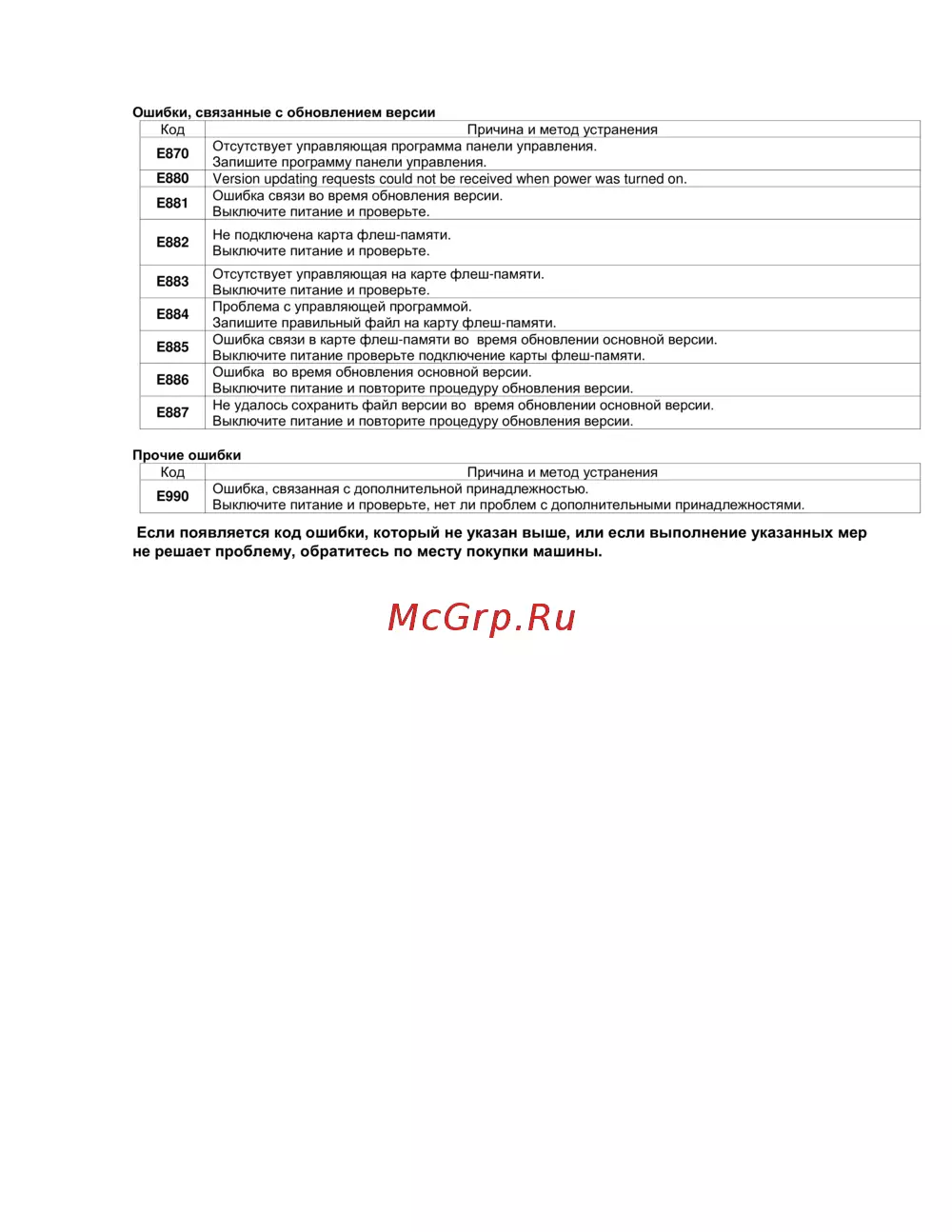 Если появляется код ошибки, который не указан выше, или если выполнение указанных мер