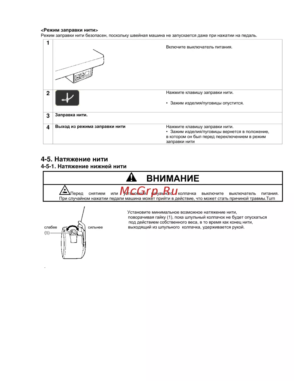Режим заправки нити безопасен, поскольку швейная машина не запускается даже при нажатии на педаль.