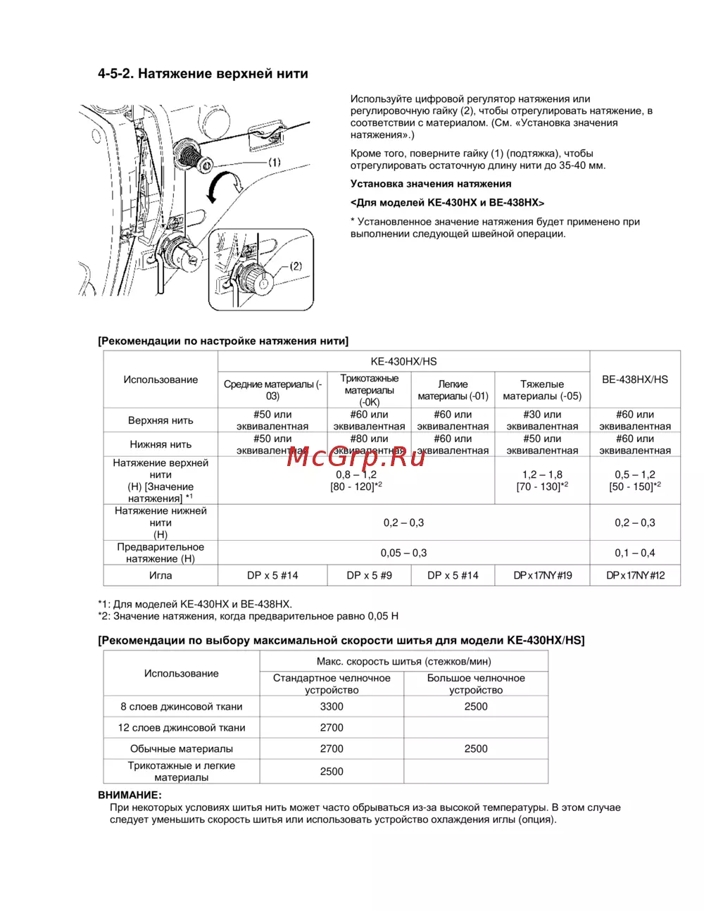[Рекомендации по выбору максимальной скорости шитья для модели KE-430HX/HS]