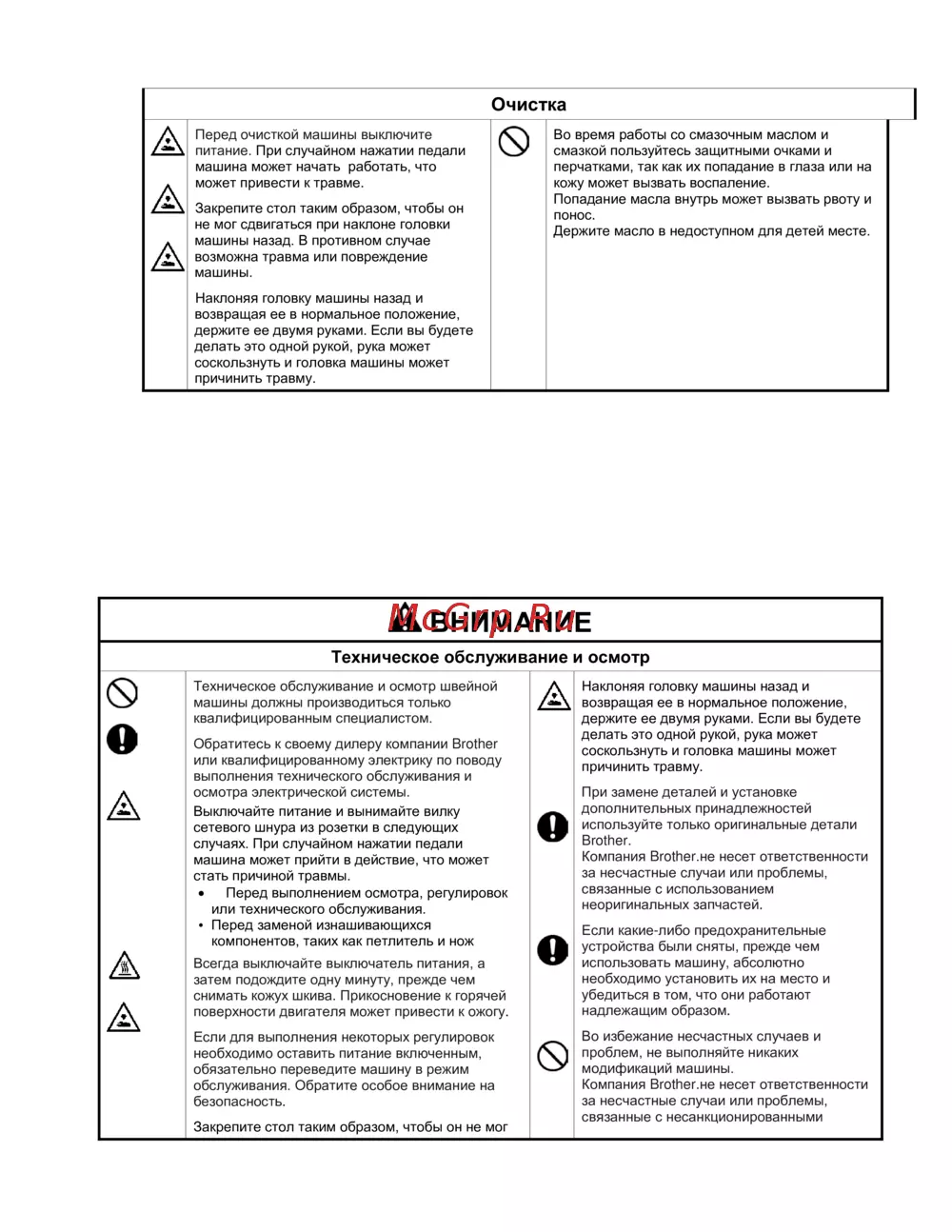 Узнайте, как правильно очищать и обслуживать швейную машину, чтобы избежать травм и повреждений. Следуйте рекомендациям по безопасности и техническому обслуживанию.