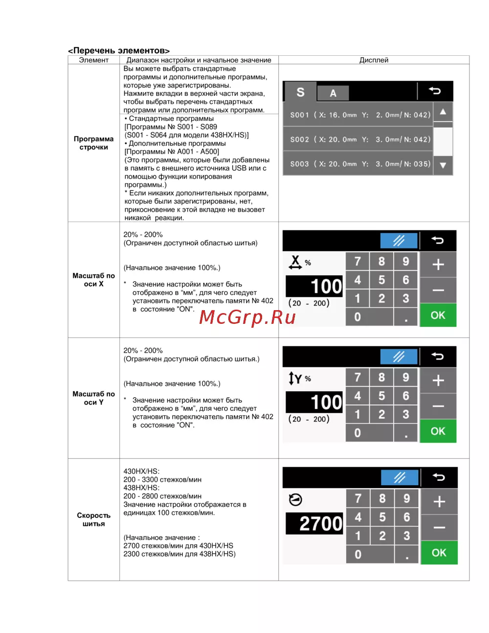 Изучите возможности настройки программ шитья, включая стандартные и дополнительные опции. Узнайте о диапазонах настройки и начальных значениях для оптимального шитья.